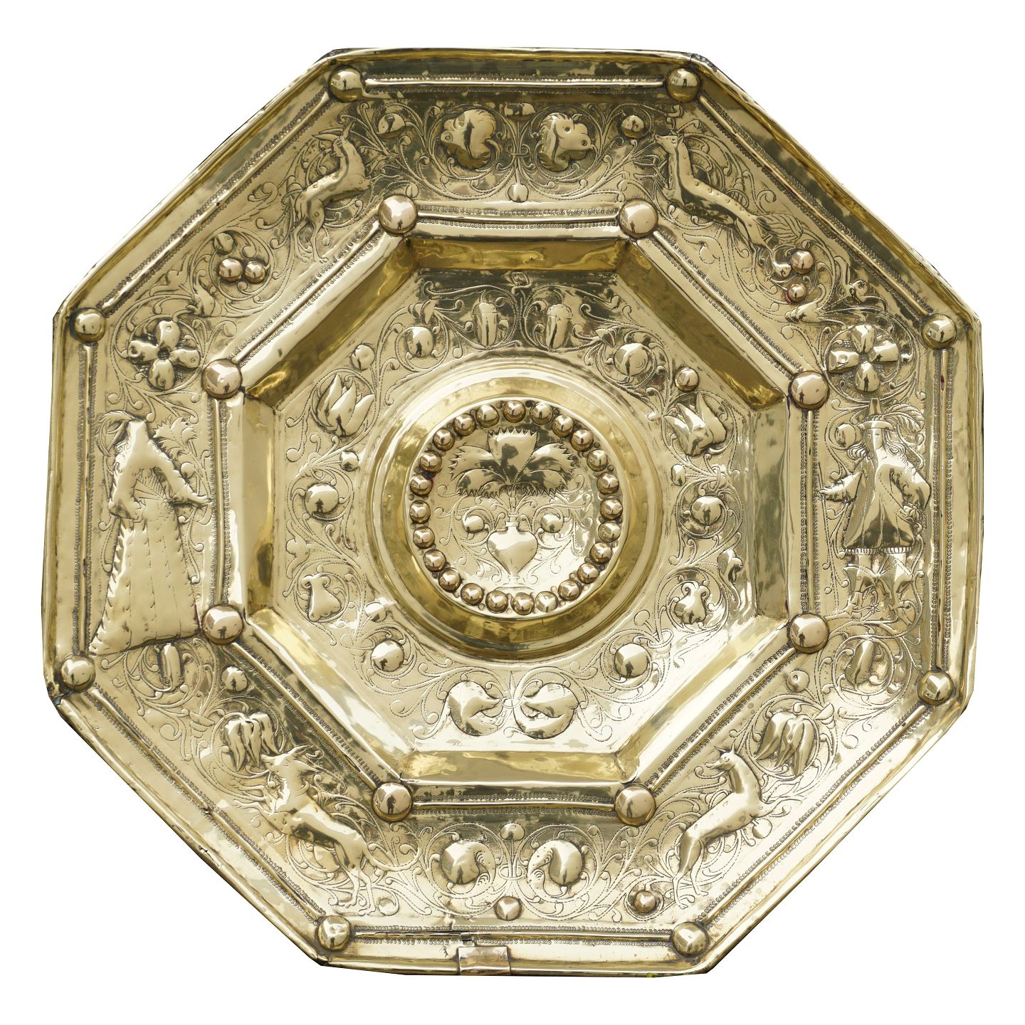 Large early Baroque brass baptism bowl. Circa 1650. D: 65cm