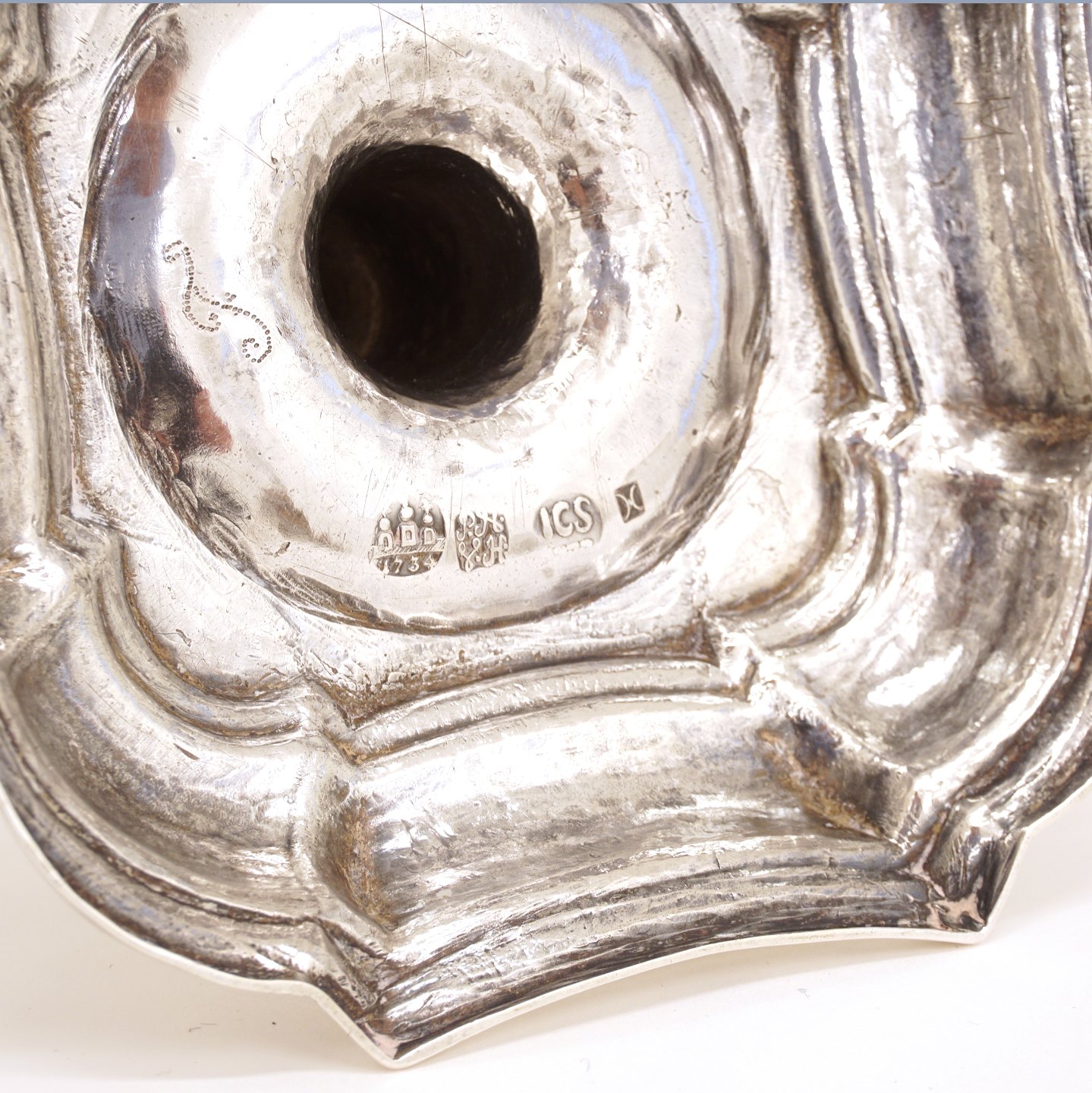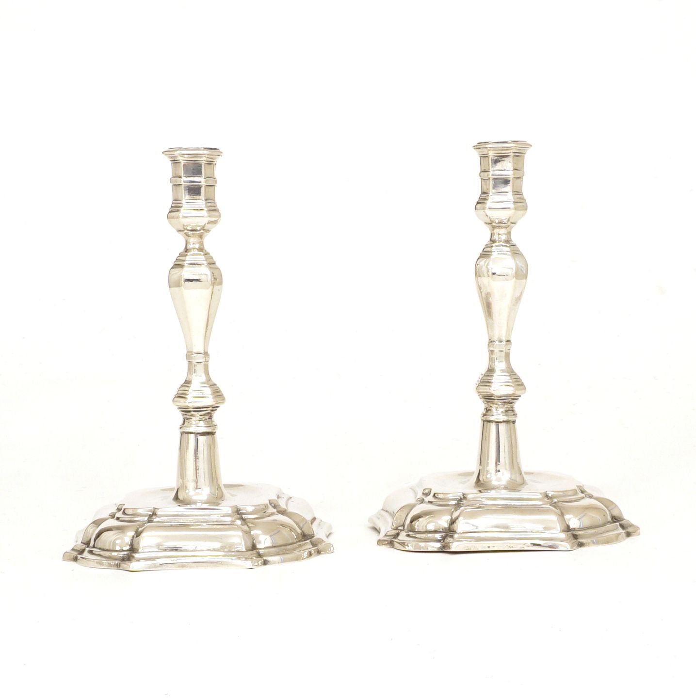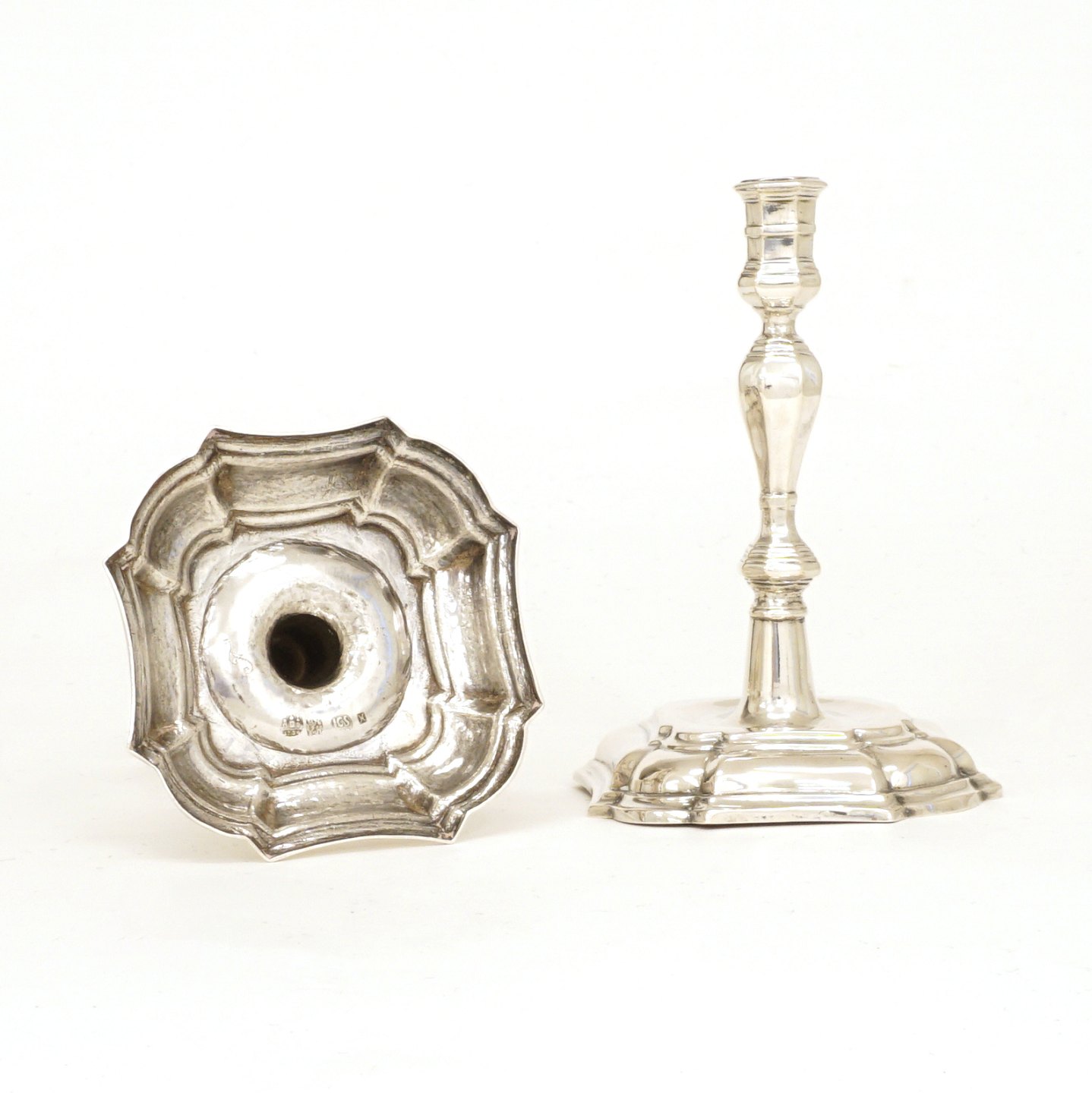 A pair of silver candle holders, baroque Jens Christensen, Copenhagen, 1734 Sturdy and in good quality H: 19cm. W: 658gr Item number: 26574