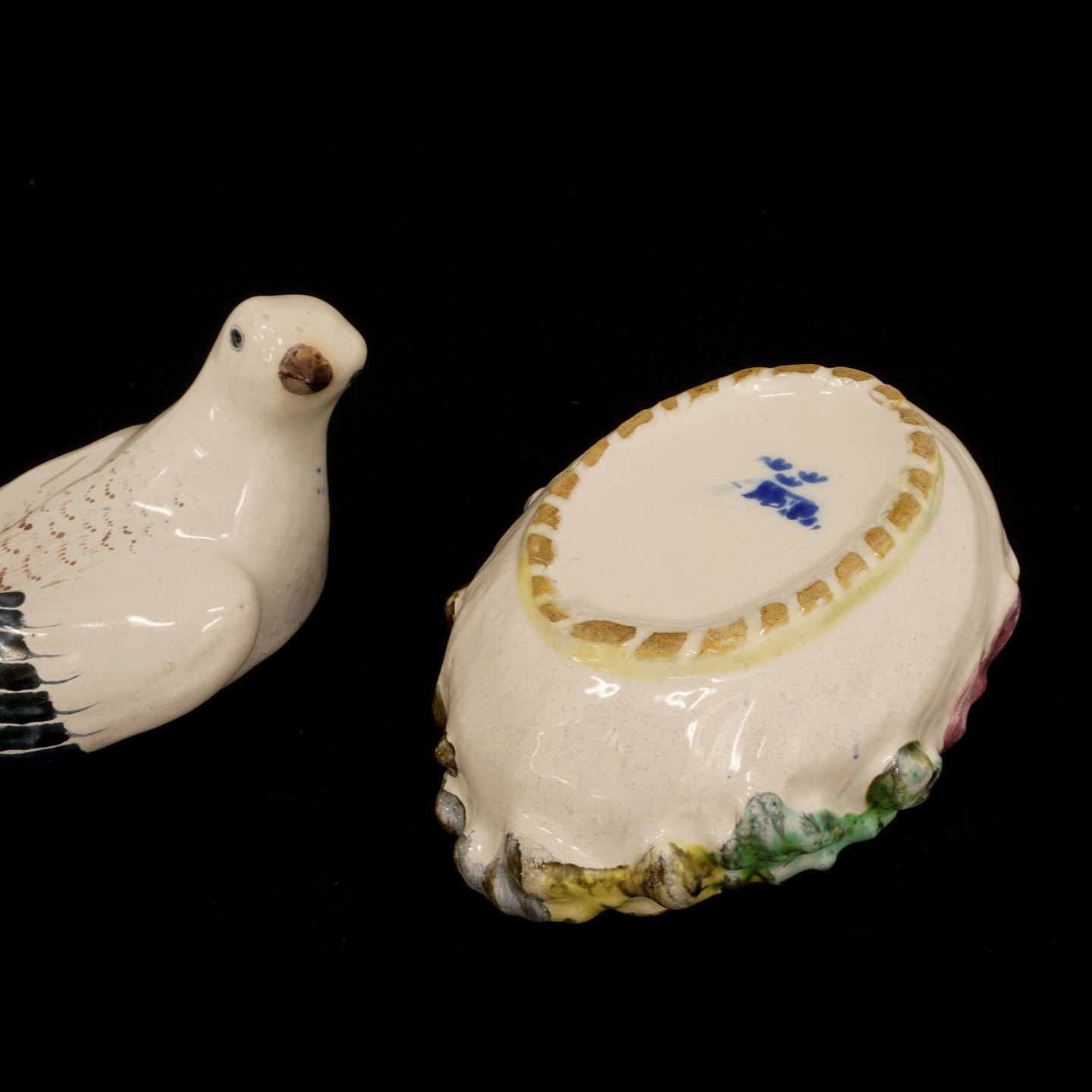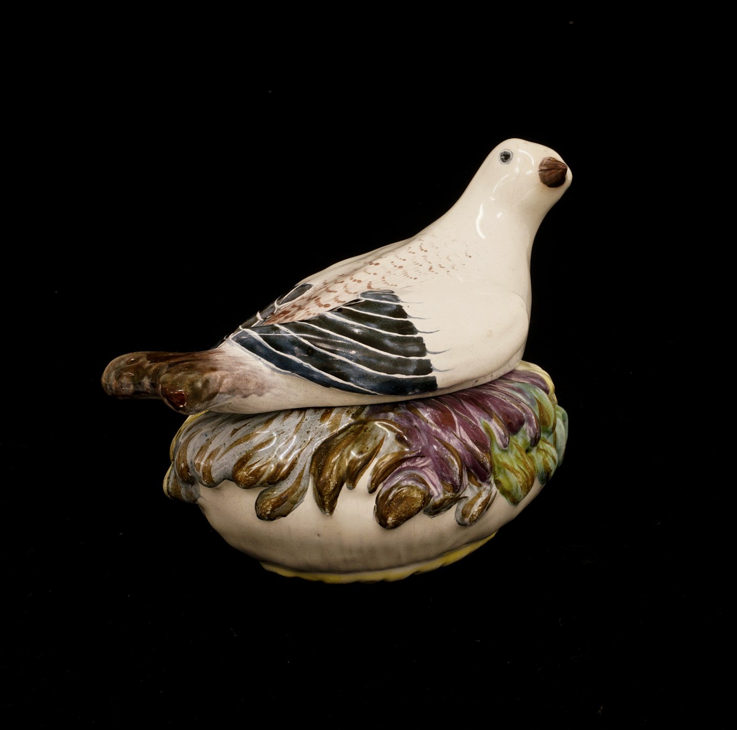 Polykrom dekoreret smør terrin, fajance. Signeret Marieberg. Sverige ca. år 1765. L: 17cm. H: 13,5cm