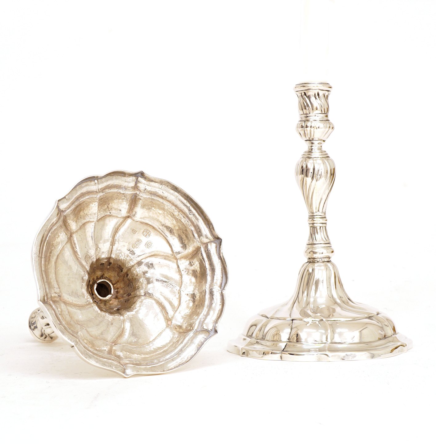 A pair of Rococo silver candelsticks. Søren Bay, Copenhagen, 1743-53. Dated 1752. H: 19,5cm. W: 739gr
