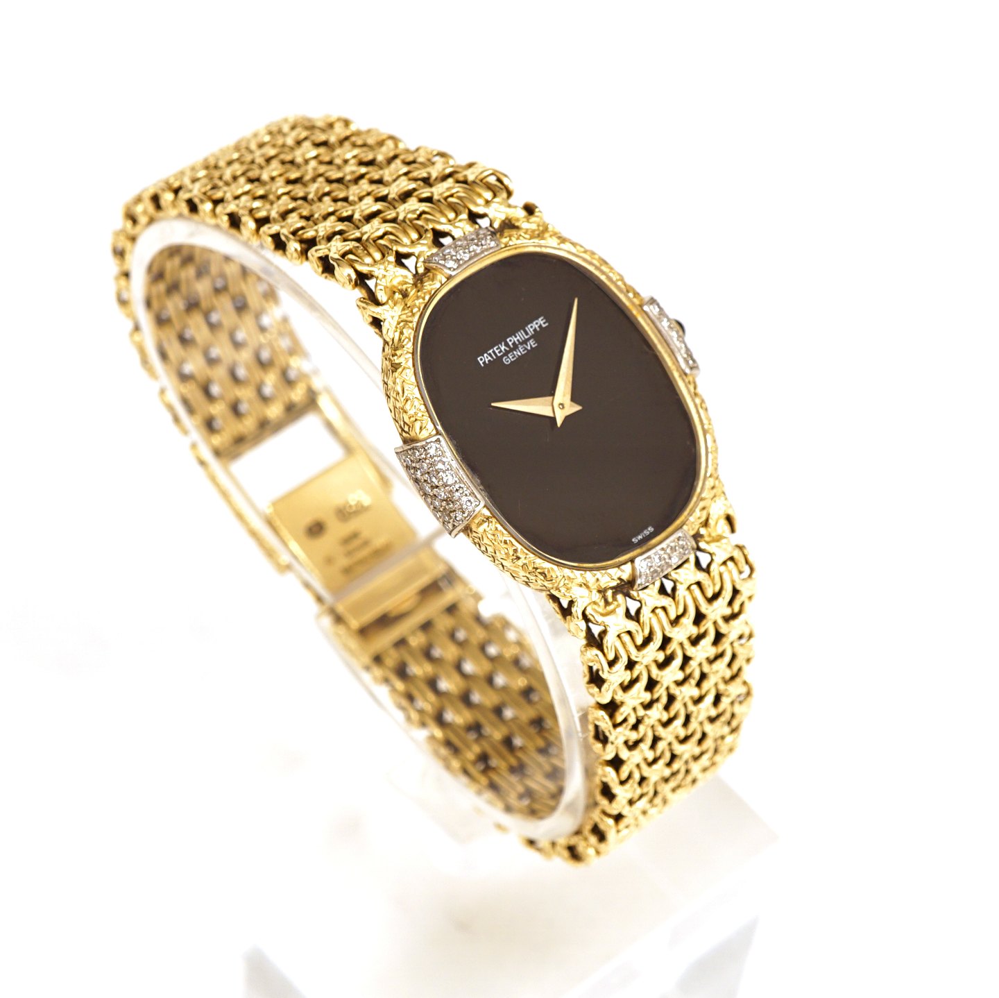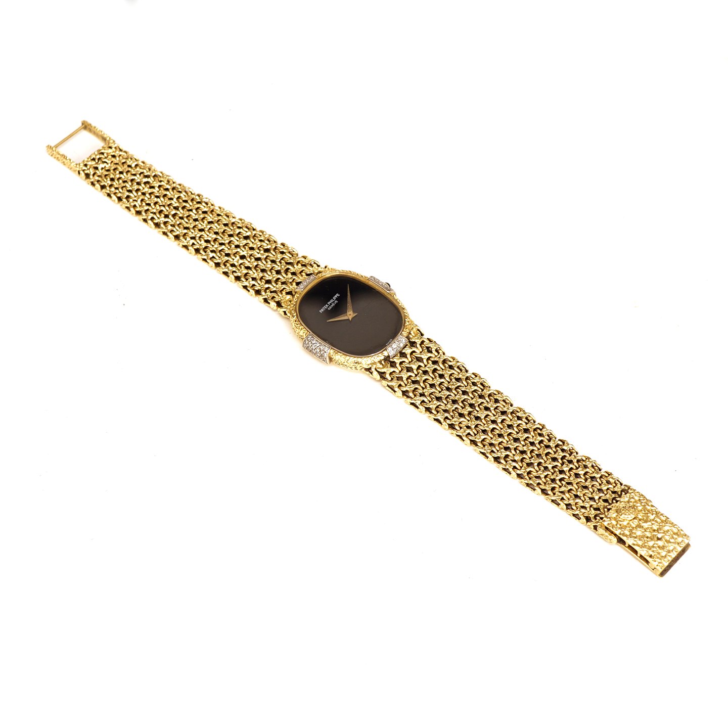 Patek Phillipe Golden Ellipse 18ct Gold with diamonds. Black onyx dial. Ref. 4307. Size dial: 2,5x2,1cm. Bracelet L: 18,5cm
