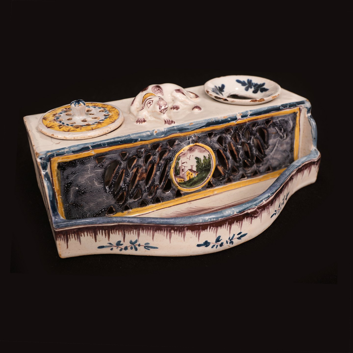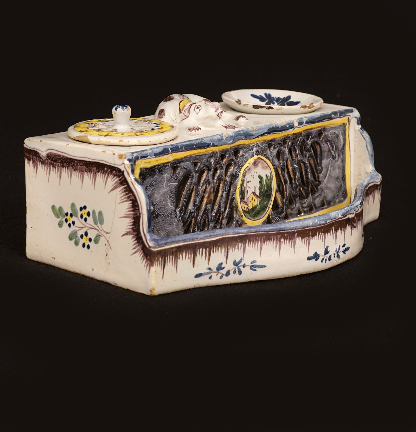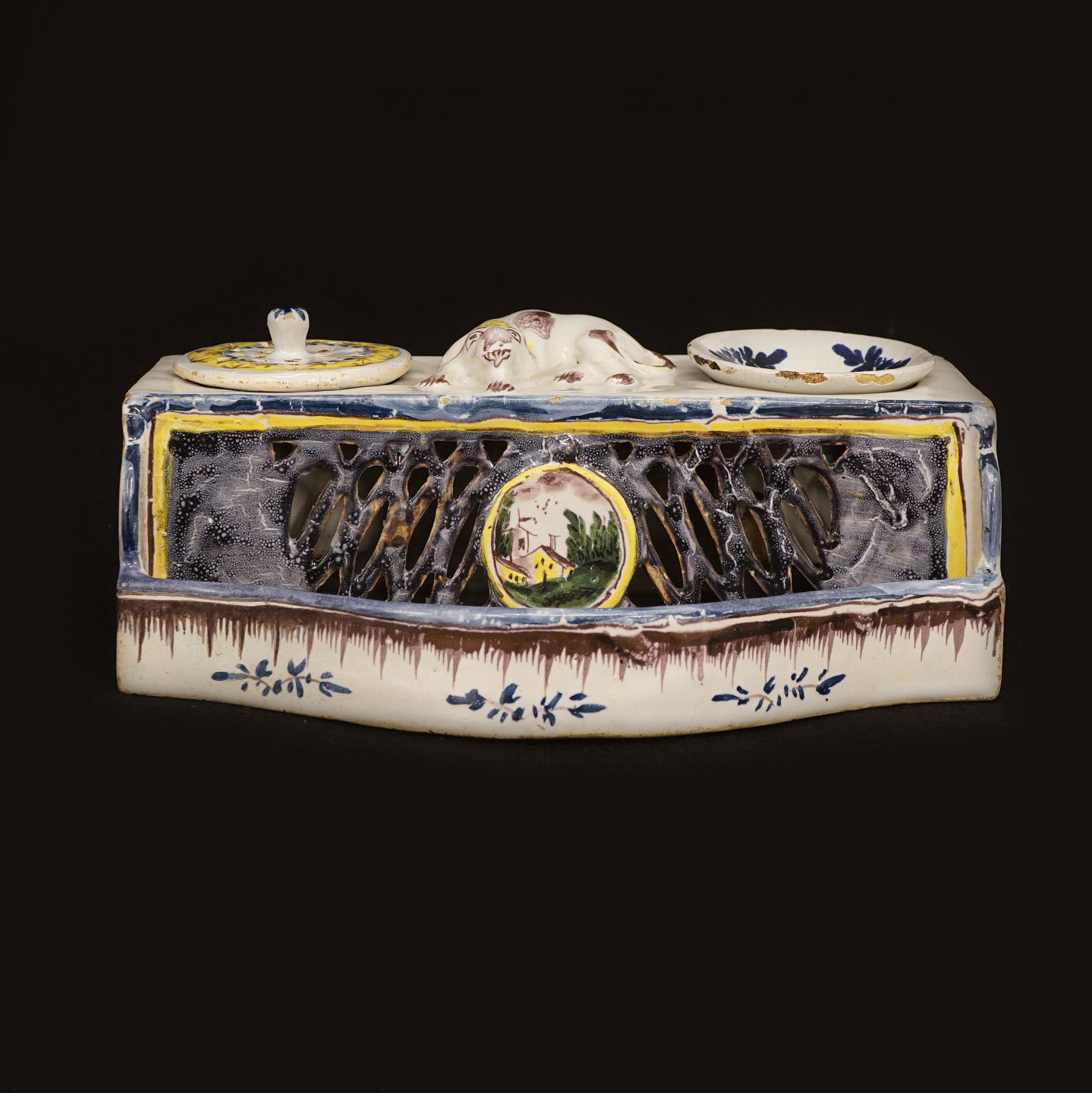 An end 18th century writing set of faience. Kellinghusen, Northgermany, circa 1790. H: 8cm. L: 20cm. D: 12,8cm