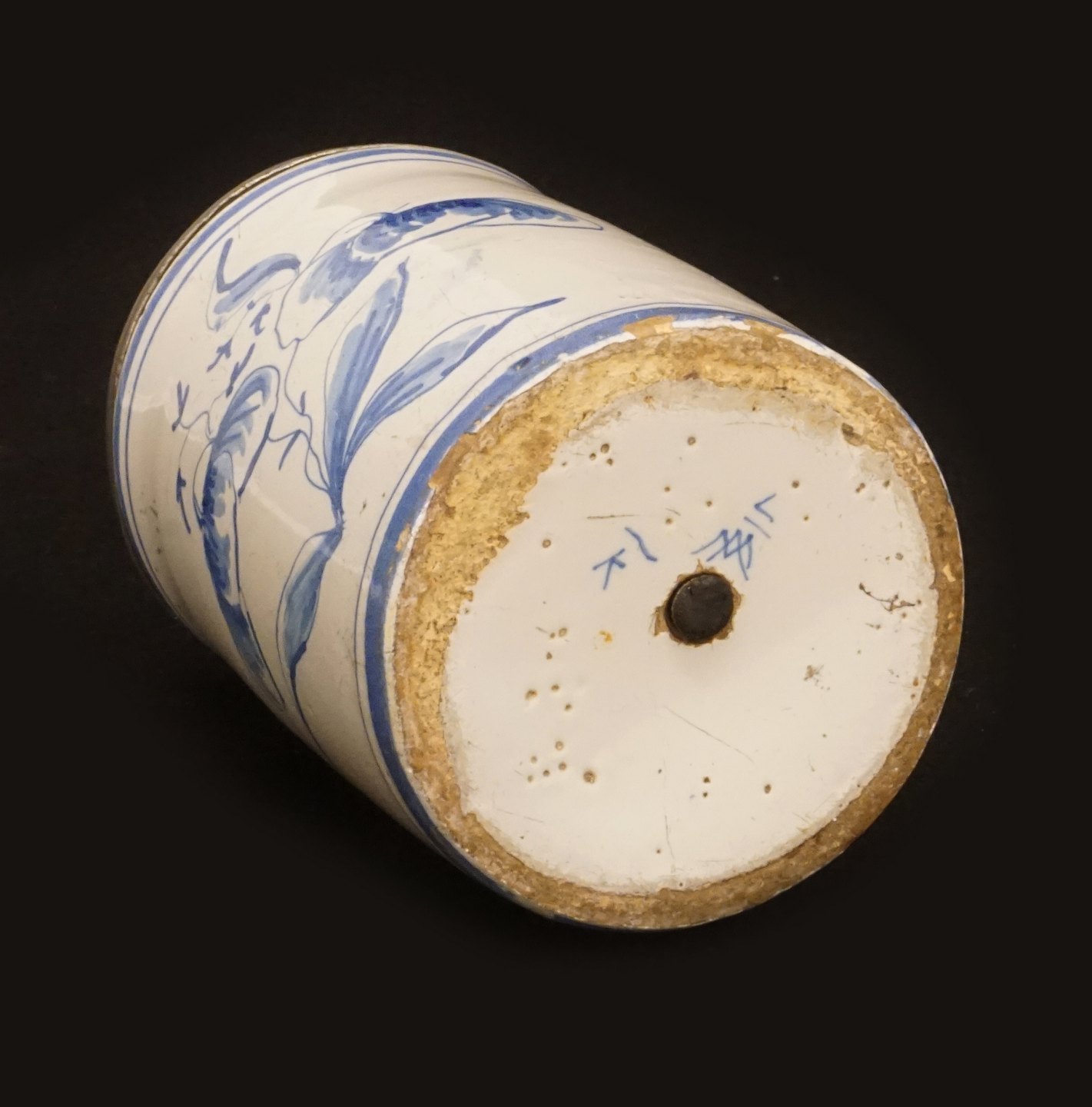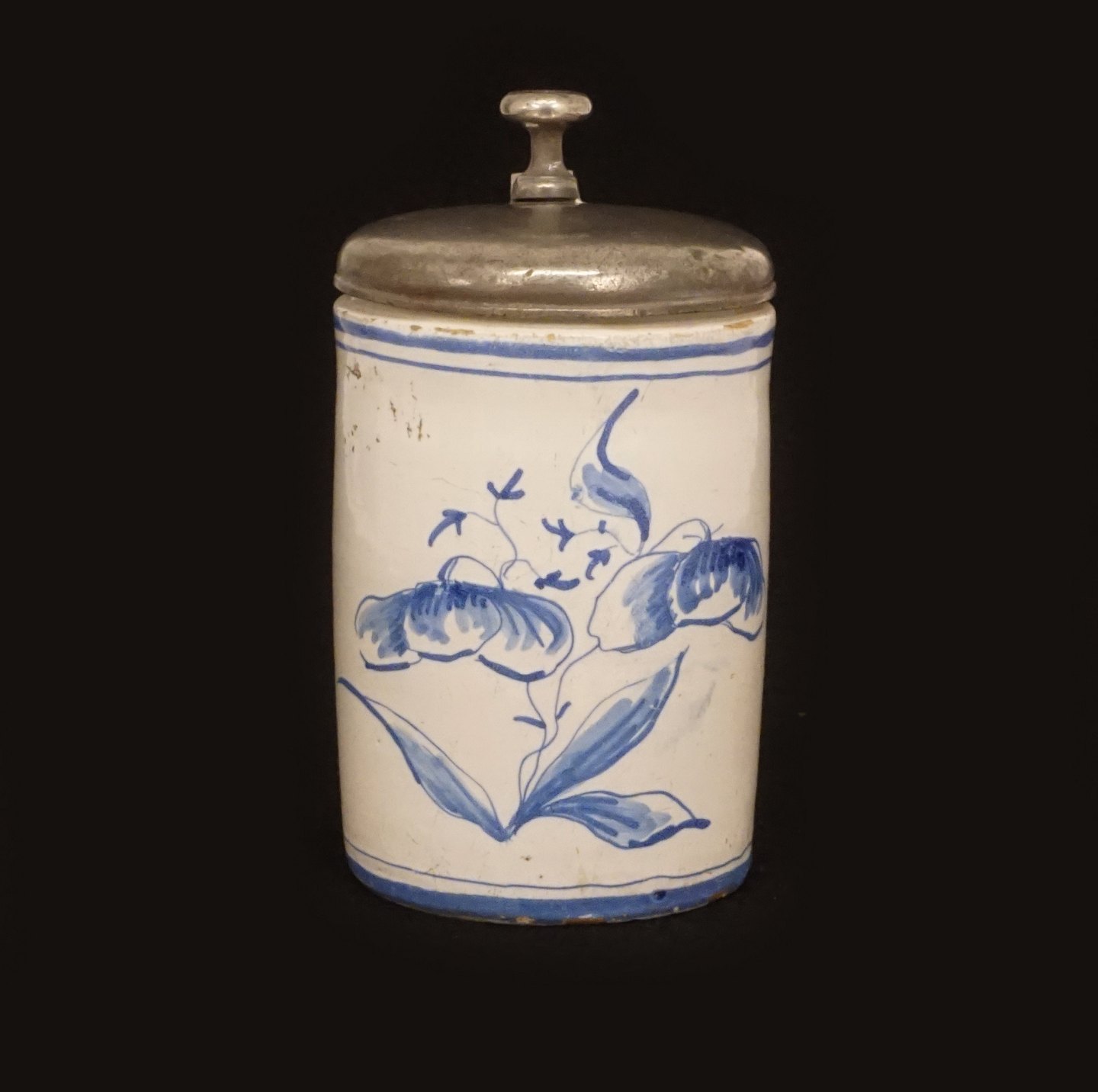 Lågkrus af fajance med tinlåg. Signeret Morsø Fajancefabrik ca. år 1780. H: 15cm