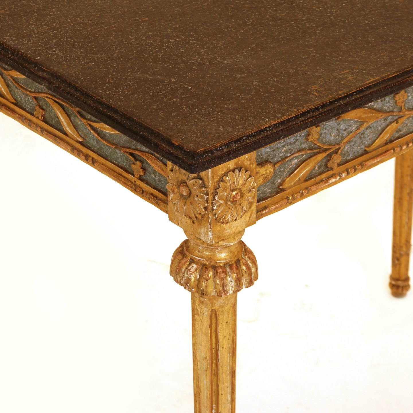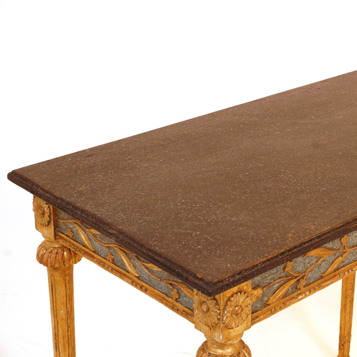 Forgyldt Louis XVI-konsol med træplade prydet med porfyr imitation. Sverige ca. år 1780-1800. H: 73cm. Plade: 47x86cm