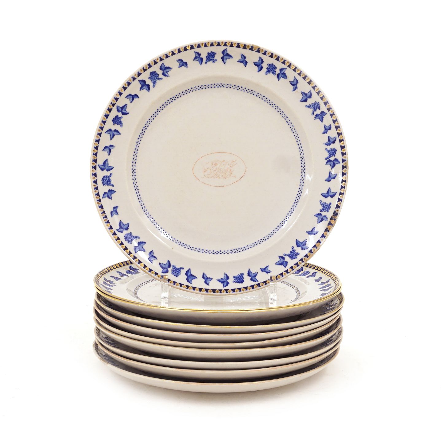 Sæt på ti dansk ostindiske tallerkner med monogrammer i oval