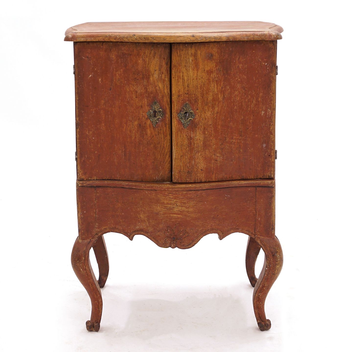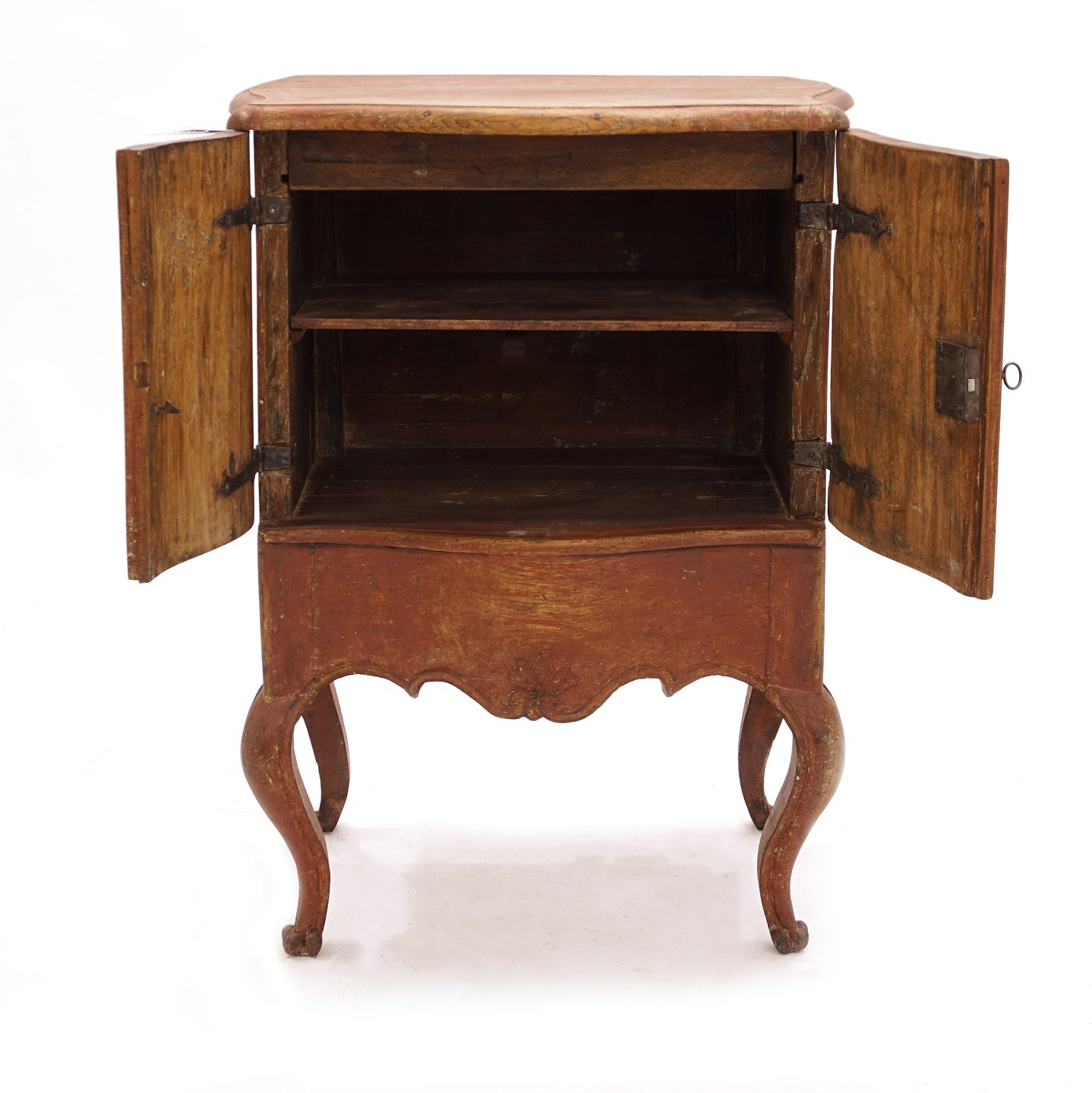 Røddekoreret rokoko natskab med to låger bag hvilke hylder. Sverige ca. år 1760. H: 86cm. B: 63cm. D: 43cm