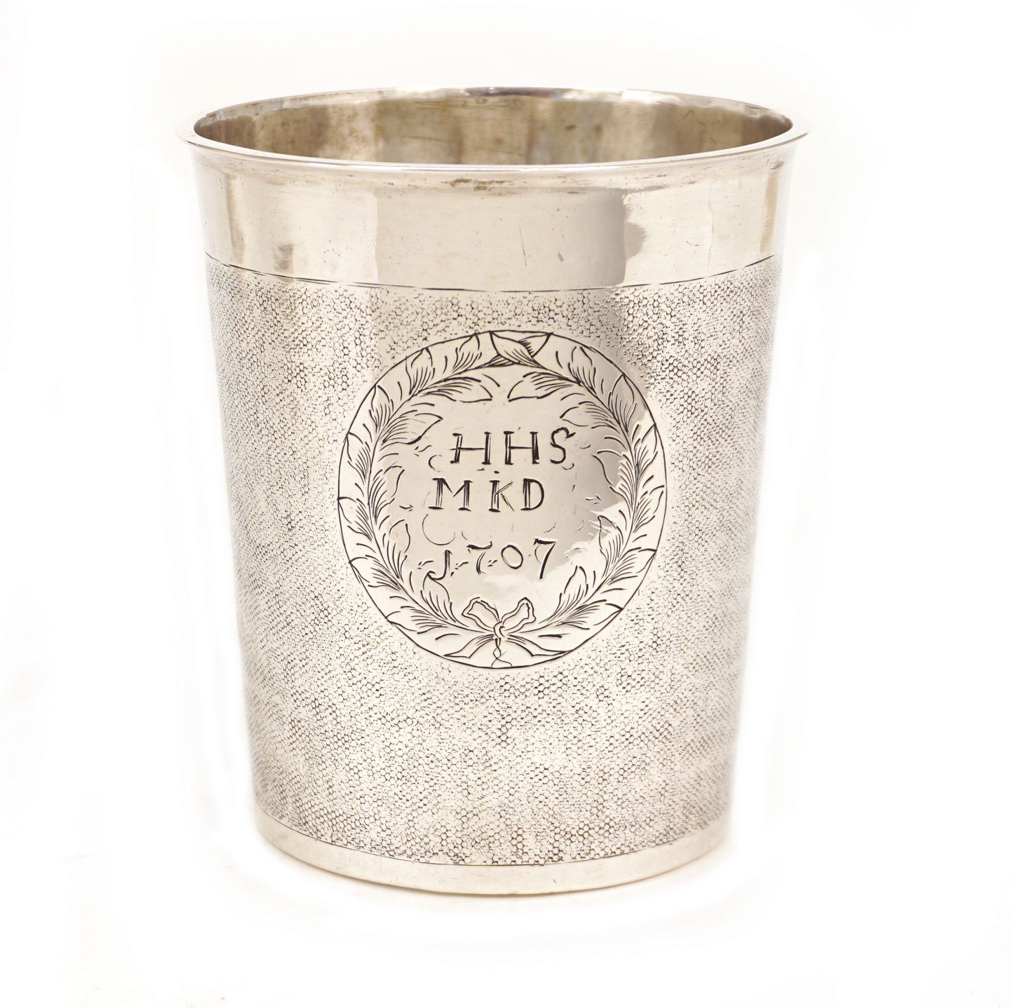 Stort nålepunslet sølvbæger dateret 1707