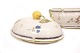 Polykrom dekoreret Stralsund terrin med underfad. Låggæk i form af citron. Fremstillet ca. år 1770. L fad: 41cm. H: 24cm