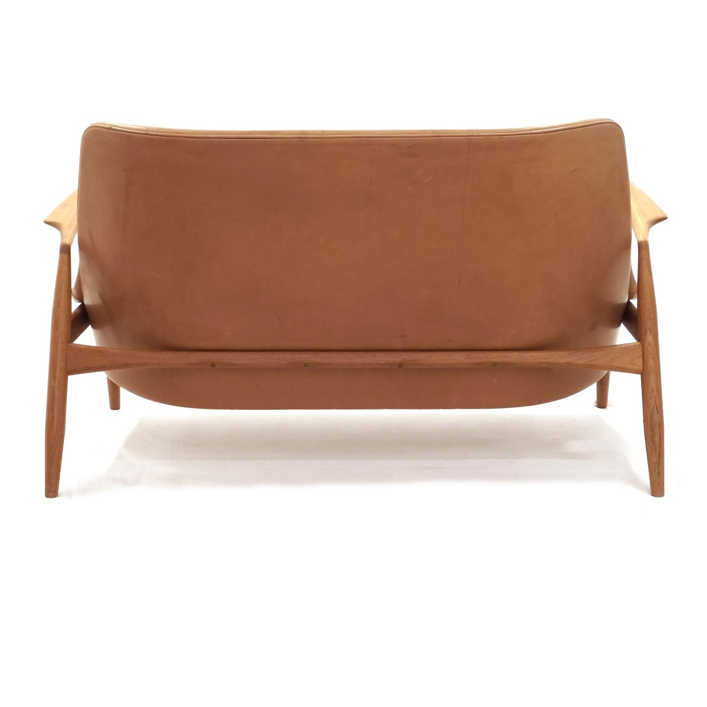 Ib Kofod-Larsen Sælen topersoners sofa i patineret cognac farvet læder. Ib Kofoed-Larsen, 1921-2003, formgav Sælen i 1957. Stel i teak. Udført af Brdr. Petersen Polstermøbelfabrik. L: 138cm