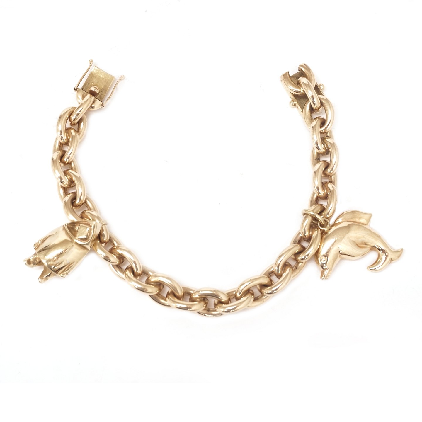 14kt gold anchor bracelet with two charms. L: 22cm. W: 116,3gr