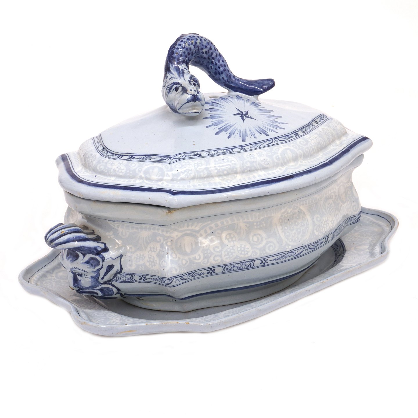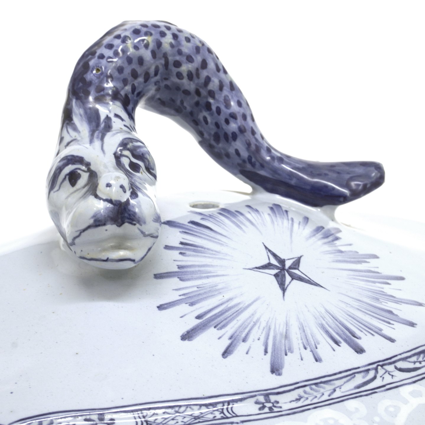 Mid 18th century Swedish faience tureen with plate signed Stockholm 6/6 1750