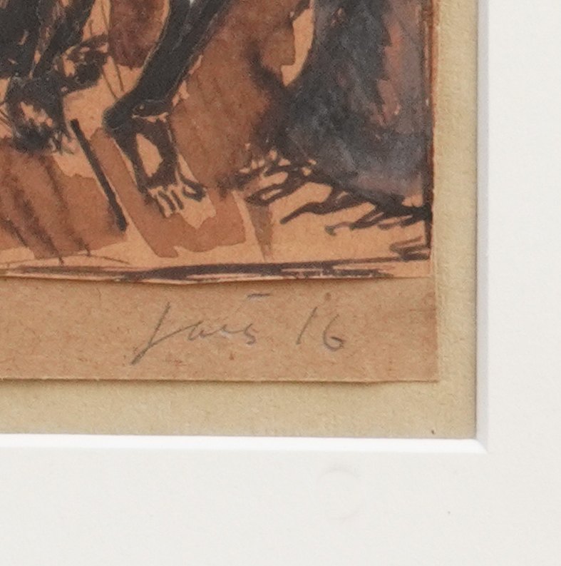 Året 1916 var ét af de mest betydningsfulde i Jais Nielsens kunstneriske virke, hvor han frembragte sine stærkeste modernistiske motiver. Nærværende leder med sin komposition tankerne hen på hovedværker som "Cirkusforestilling", "Caféliv" og "La Muâtresse Euphrasie"