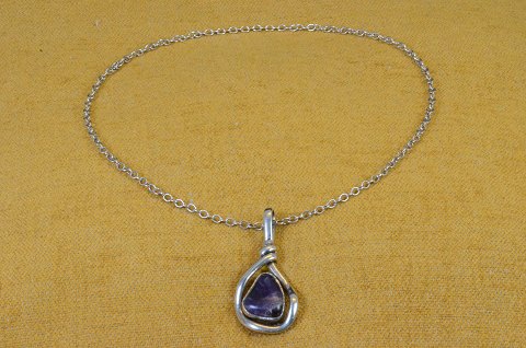 Vedhæng med ametyst 1970'erne i sølvkæde. Unika af Hans Henning ustemplet. Str.: vedhæng 7*3,5 cm , kæde 40 cm. Art No. 76