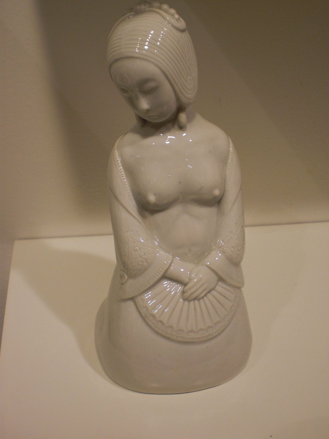 Porcelænsfigur fra den Kongelig porcelænsfabrik designet og signeret af Georg Thylstrup (1884 - 1930) i ca. 1915 -"Ung orientaler med vifte". Udført i lysgrøn celadonglasur formentlig i 1916. Højde: 21 cm . Bredde: 9 cm. dybde: 9 cm. 1.sortering. Stemplet de 3 bølgelinier og GT.