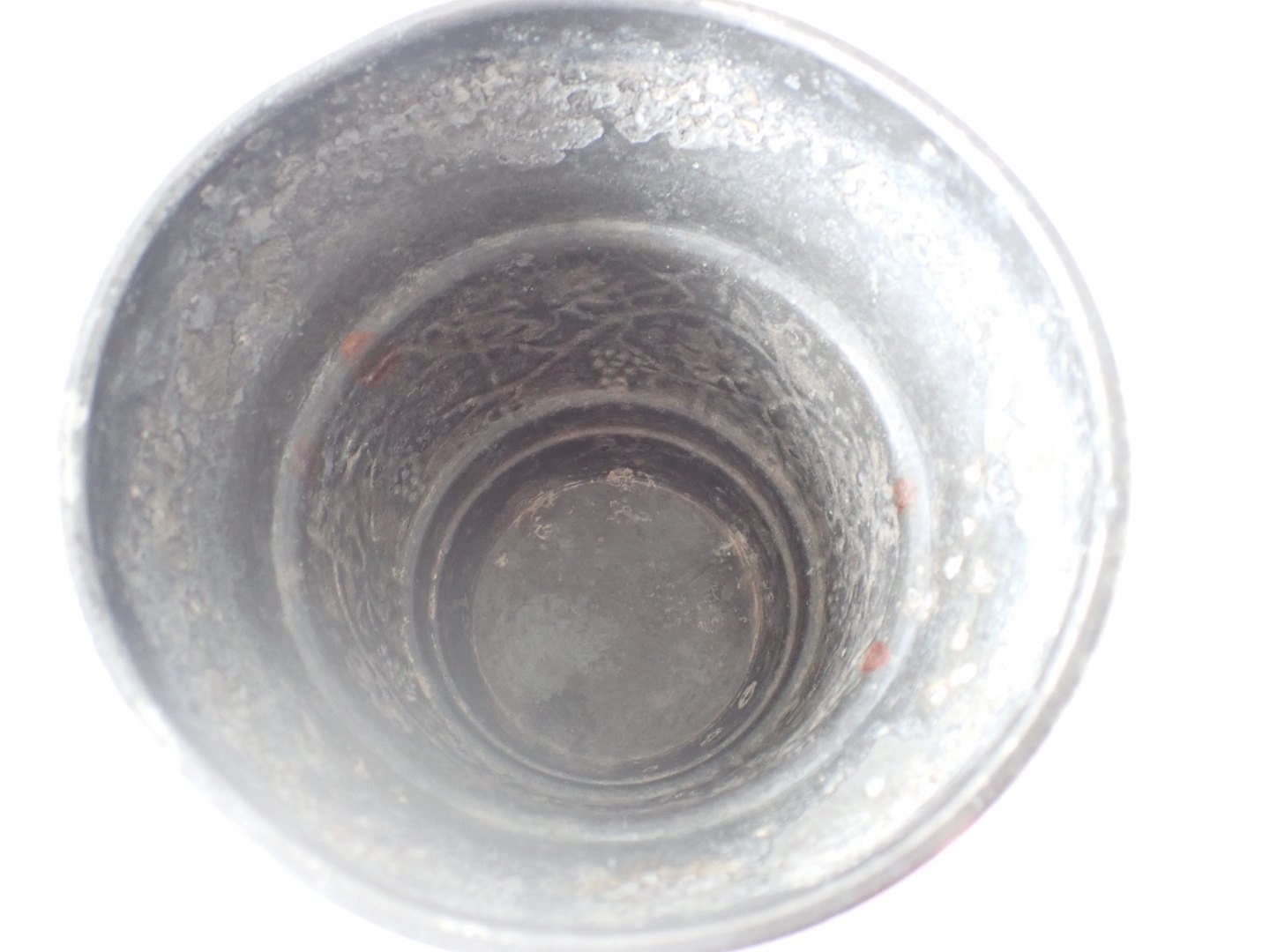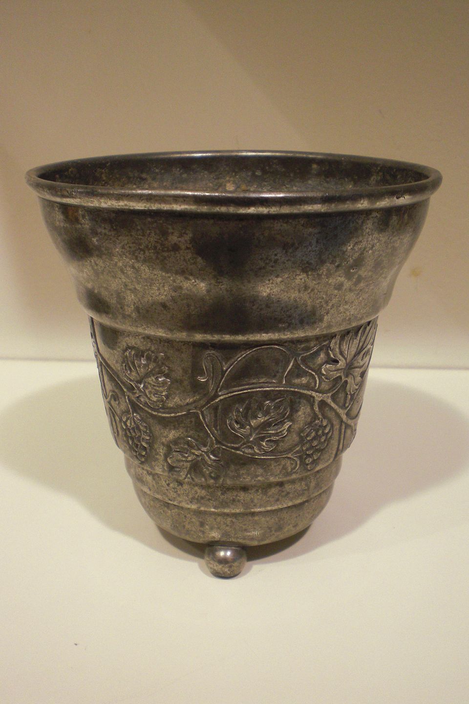 Urtepotteskjuler i tin - sjælden, men noget medtaget indvendig og lidt mørk udvendig; men med smukt bånd i form af en vinranke dekoration dekoration. Ikke i Vejen bogen. Stemplet HPH, Danmark i oval og 2119=1919. Højde: 12,5 cm. diameter foroven: 12,5 cm. .