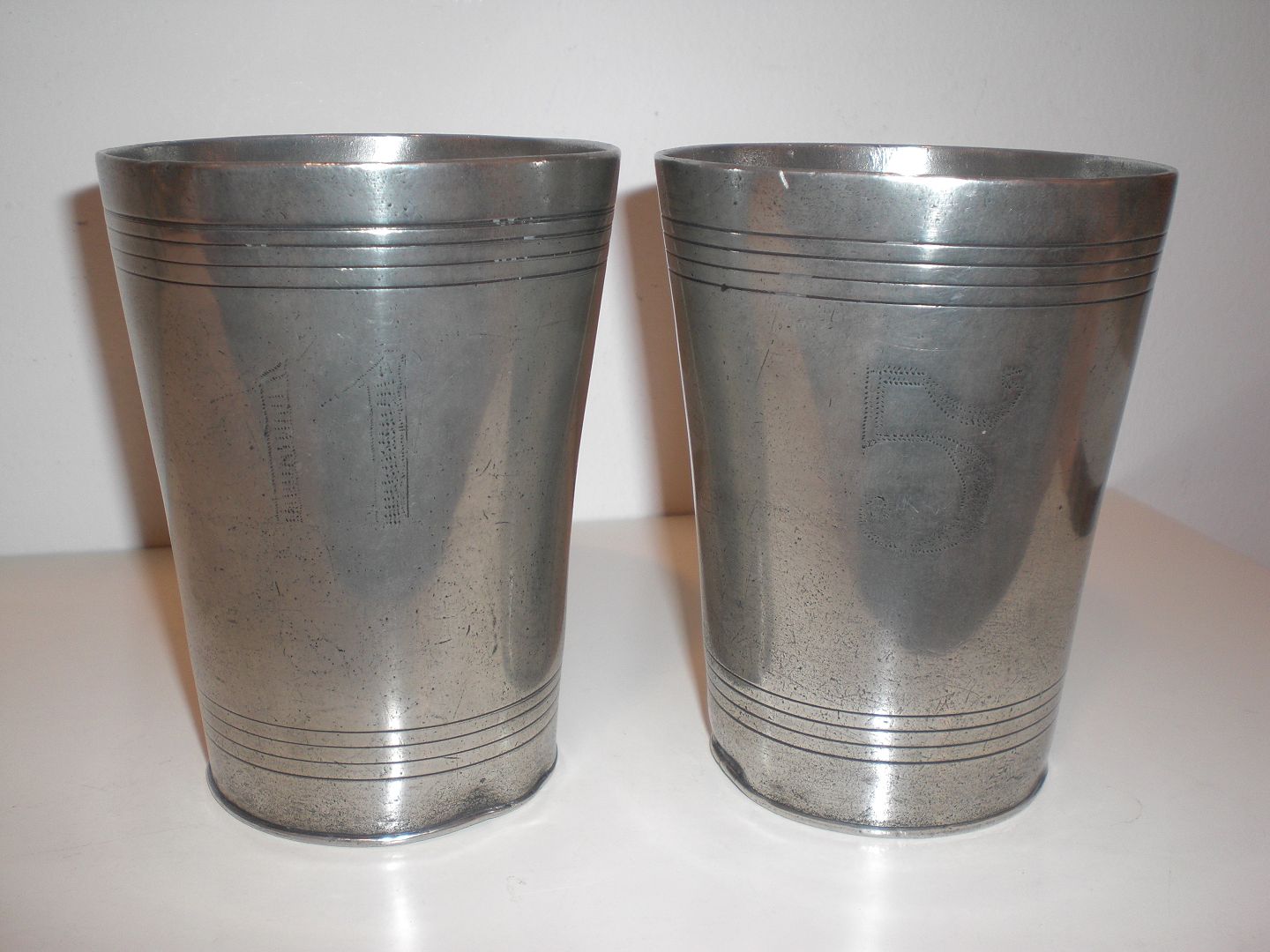 To engelske pint bægre I tin - ustemplede - med punslede numre henholdsvis 5 og 11. Højde: 12 cm. - diameter foroven: 9 cm.