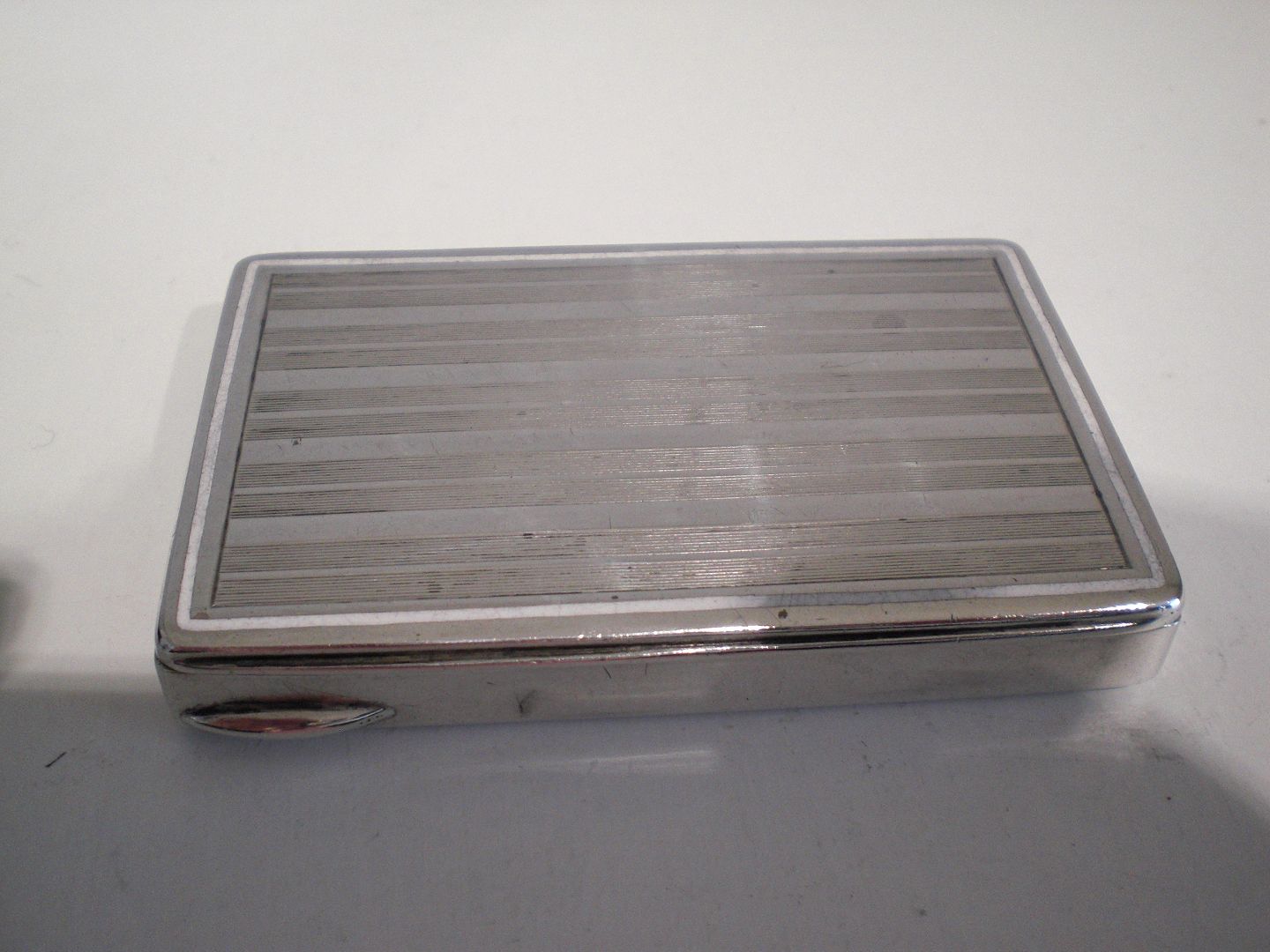 Visitkortæske i sølv med hvid emalje.