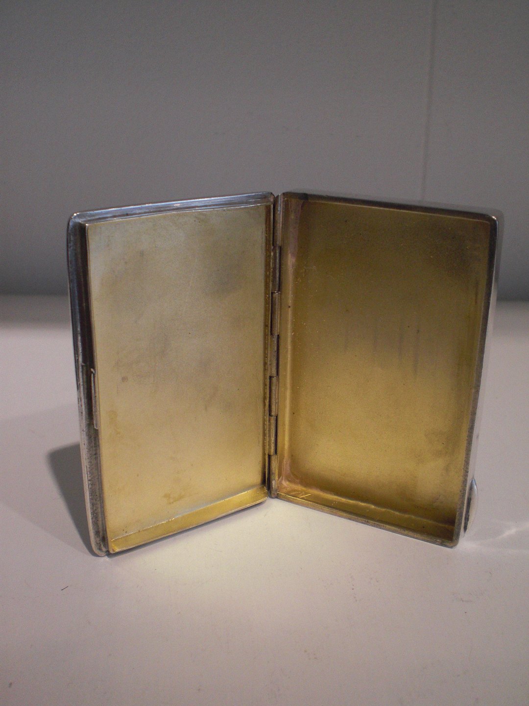 Rektangulær flad sølvæske med ciselleret lå og hvid emalje. Cigaretetui eller visitkortæske. Ustemplet men testet sølv. Forgyldt inderside. Ca. 1900. vægt: 84 gram. Højde: 1,2 cm. Længde: 7,9 cm. Bredde: 5 cm.