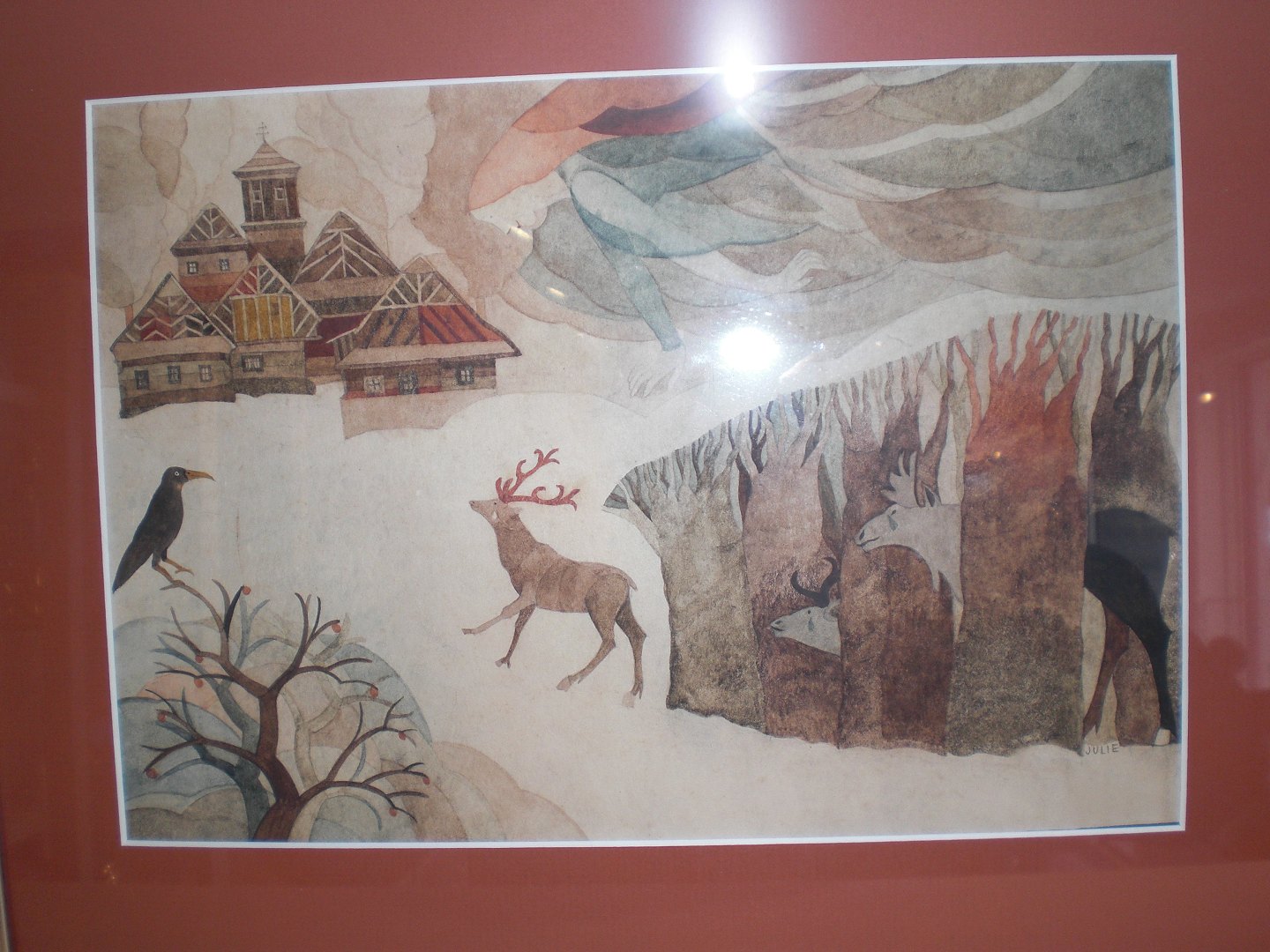 Julie Brabcova akvarel - julemandens hus? i sne bag skoven med rener.