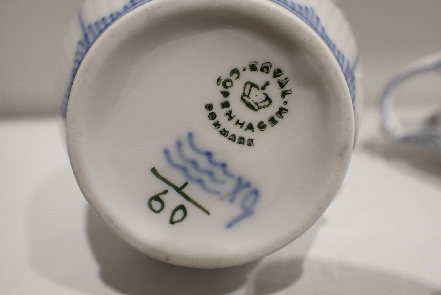 Kgl. Musselmalet riflet flødekande og sukkerskål med låg. Design 60 og 244.Moddelør j. jacobsen 1896 . 1. sort. efter 1923.