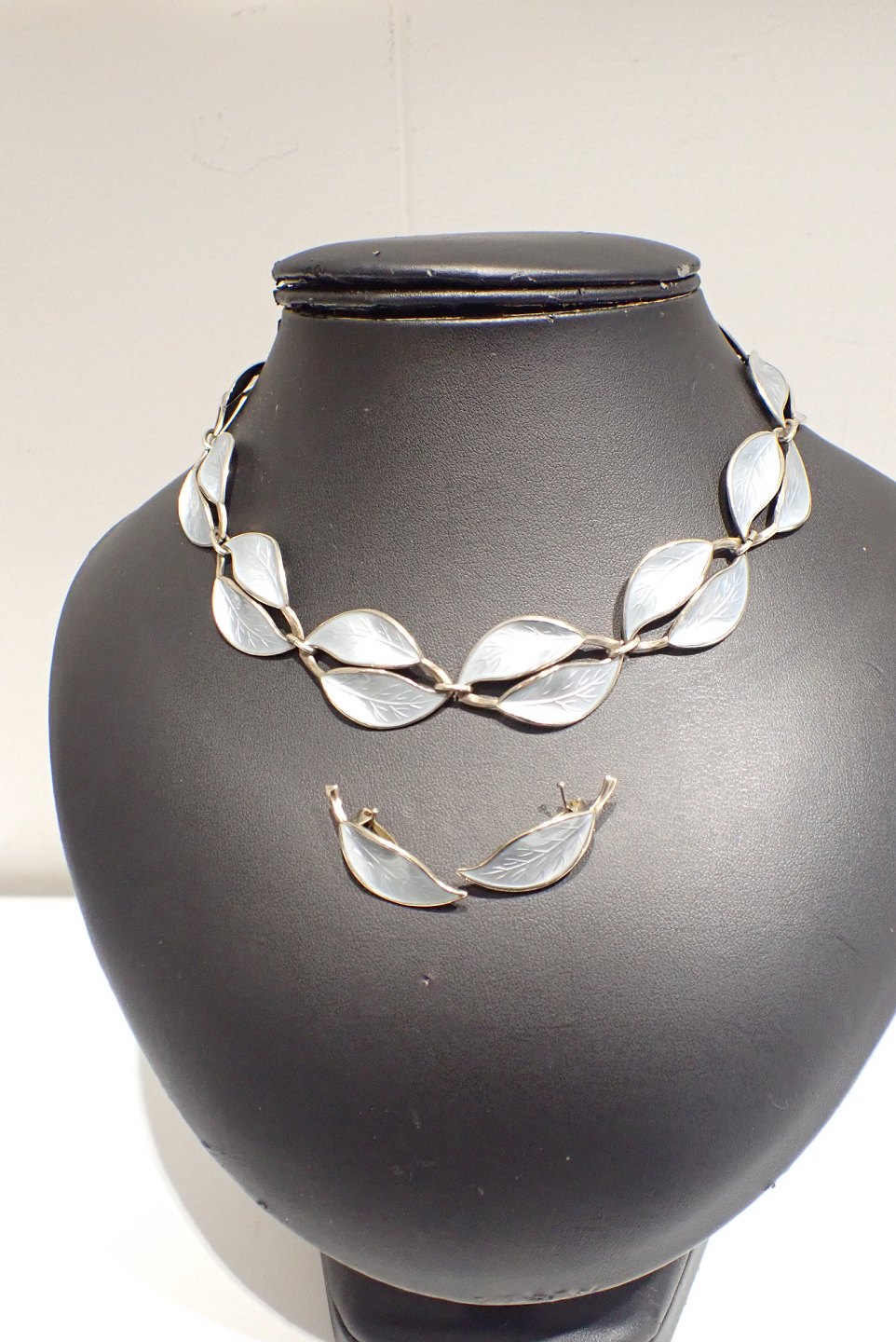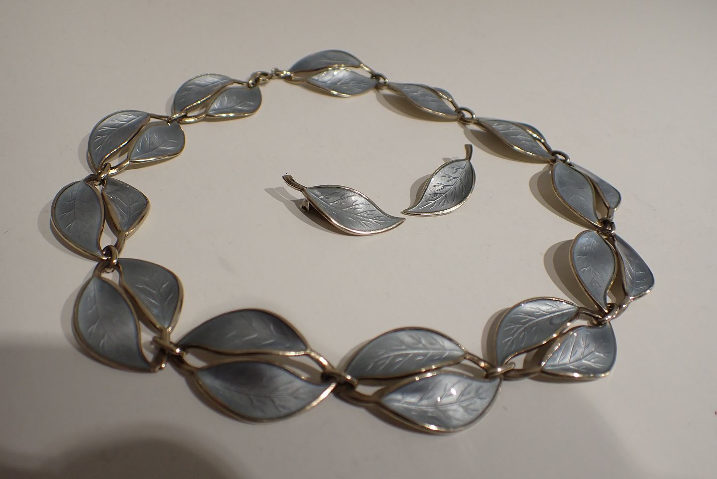 David Andersen (1880 - 1980), forgyldt, sterling sølv halskæde og øreklips med grå emalje på guilliocheret arbejde. Designet af Willy Winnanaess i 1950-erne. Stempler: Vægt i cirkel, D-A, 925s, Norway Sterling, W i cirkel. Kæden er en dobbelt række af blade. Længde på halskæde: 39 cm. Samlet vægt: 48,6 gram. I fin stand uden emaljebeskadigelser. Sælges kun samlet.