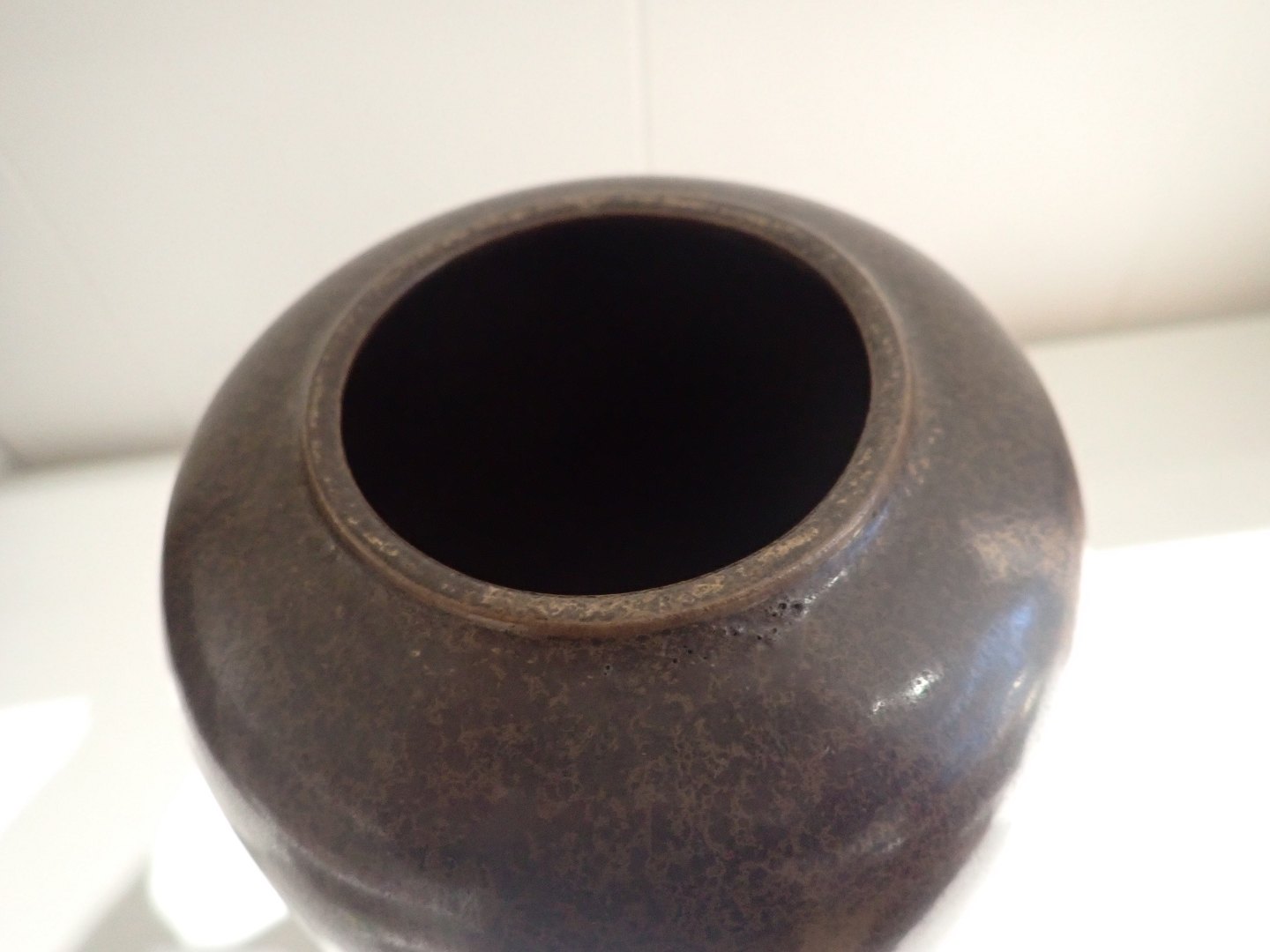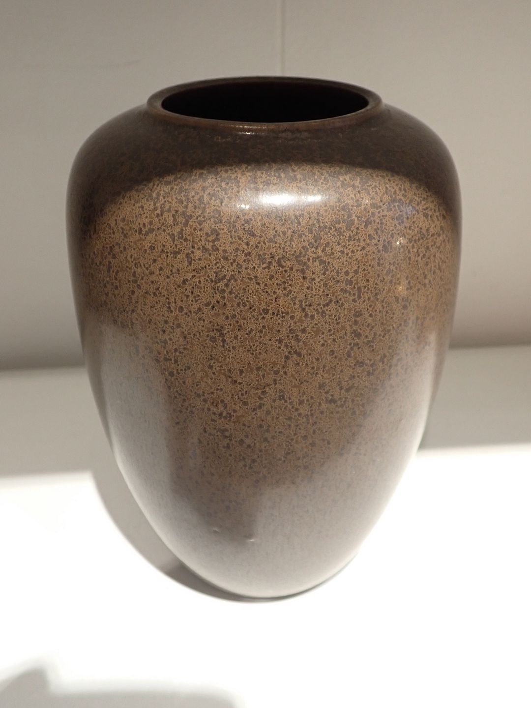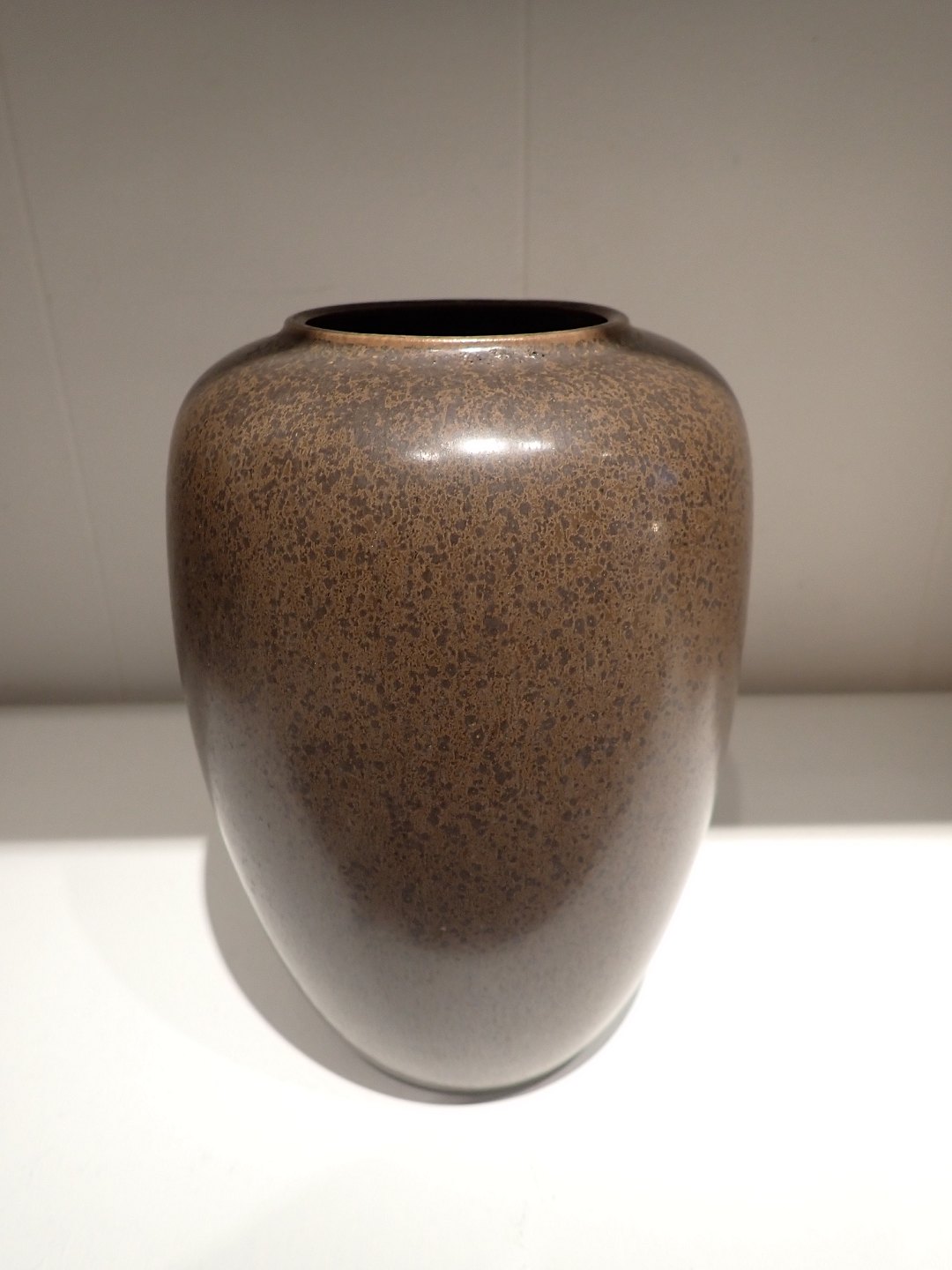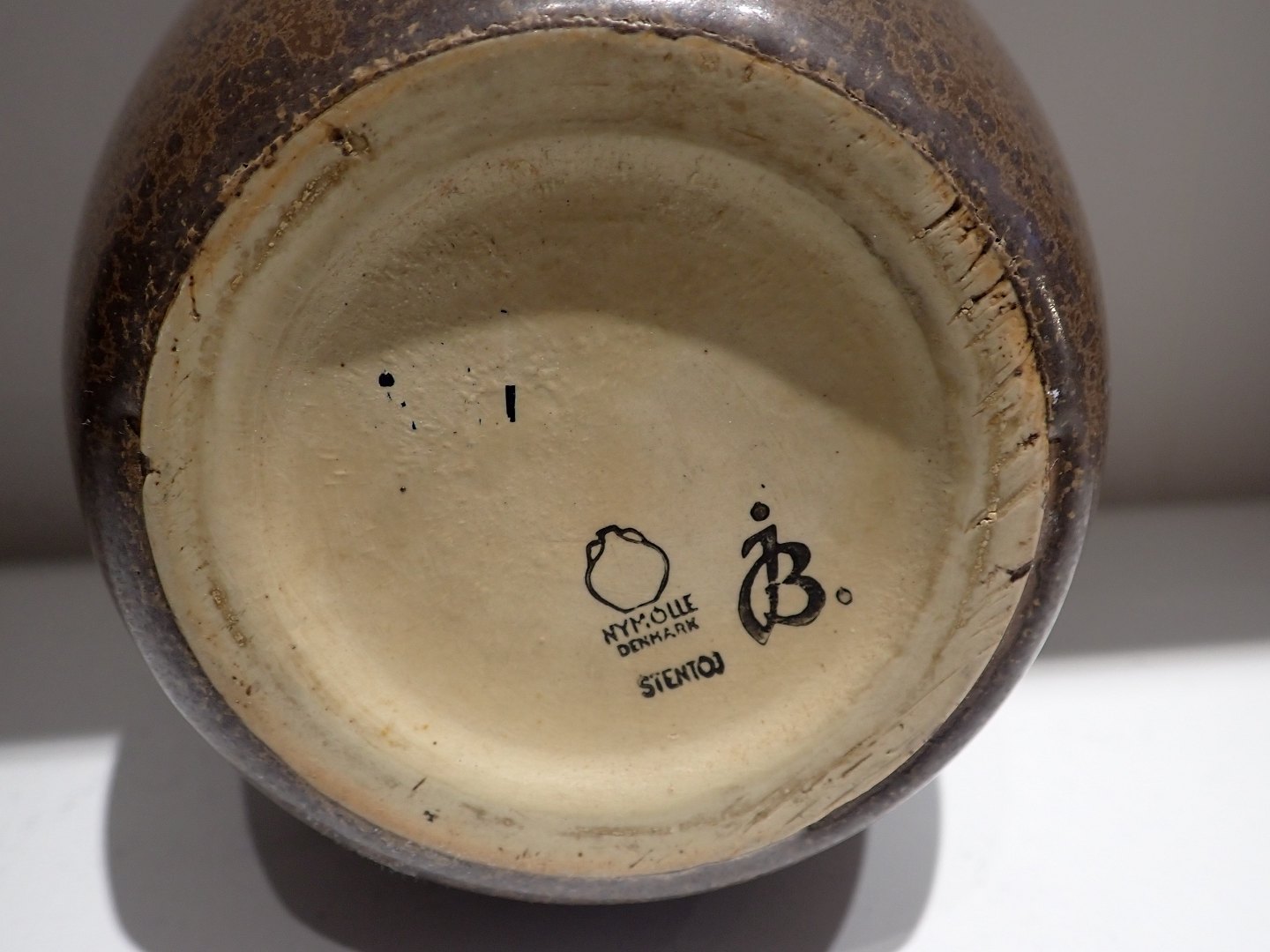 Jacob E. Bang (1899 - 1965), høj urneformet stentøjsvase med brun hareplesglasur. Nymølle 1950-erne.Signeret monogram. stempel: JB, Nymølle Danmark, Stentøj. Højde: 21,4. Bredeste diameter: 14,3 cm. I fin stand med meget få glasurfejl i brændingen.