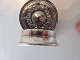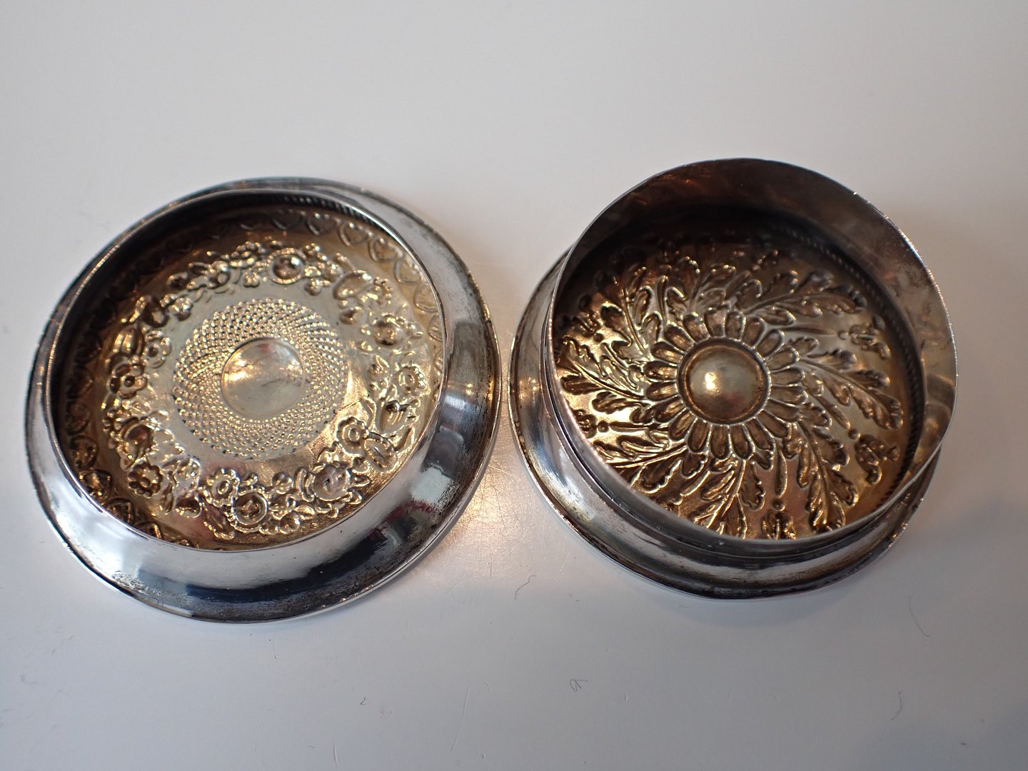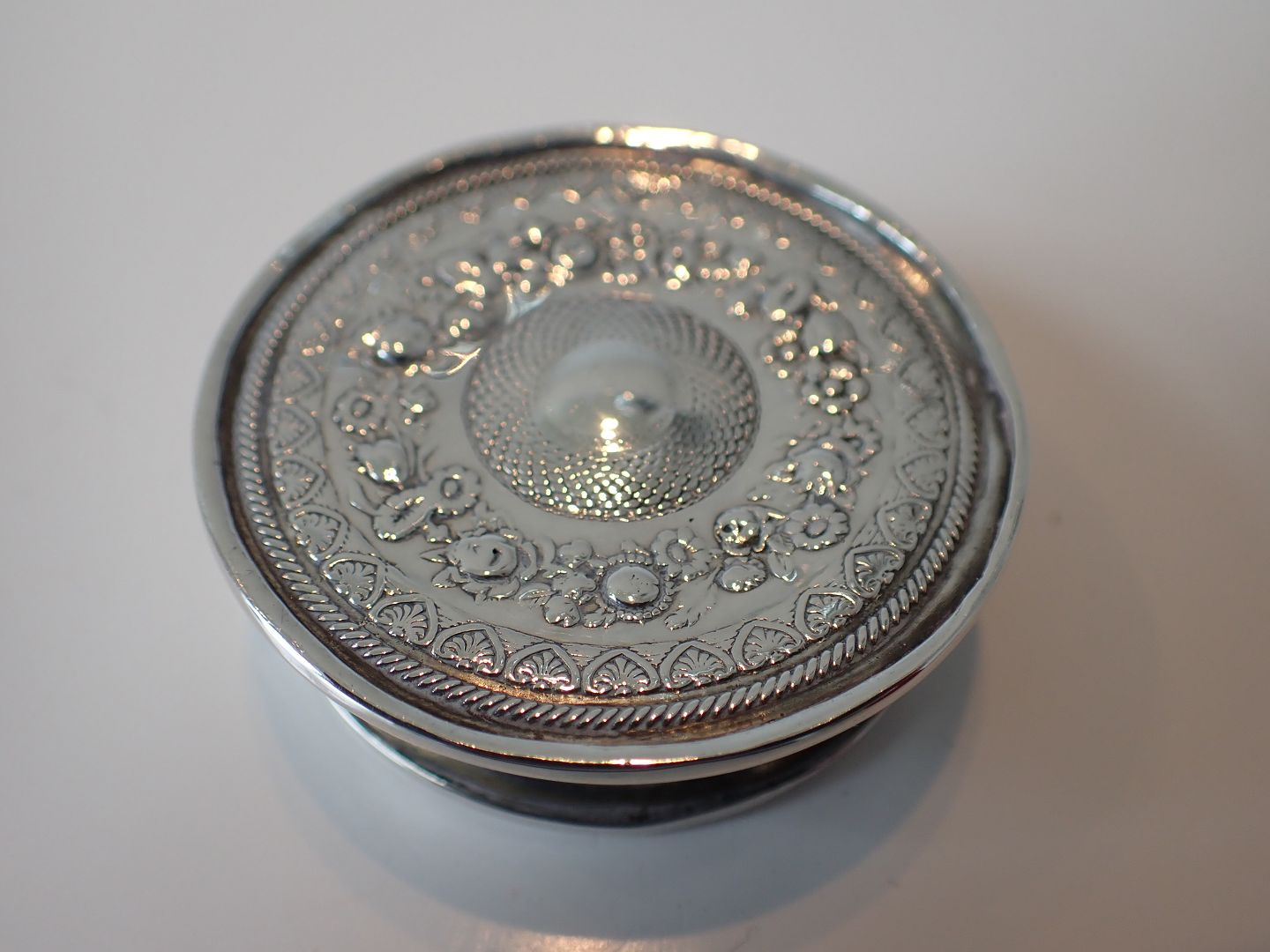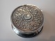 Rund pilleæske i sølv med dekoration på såvel låg som bund.