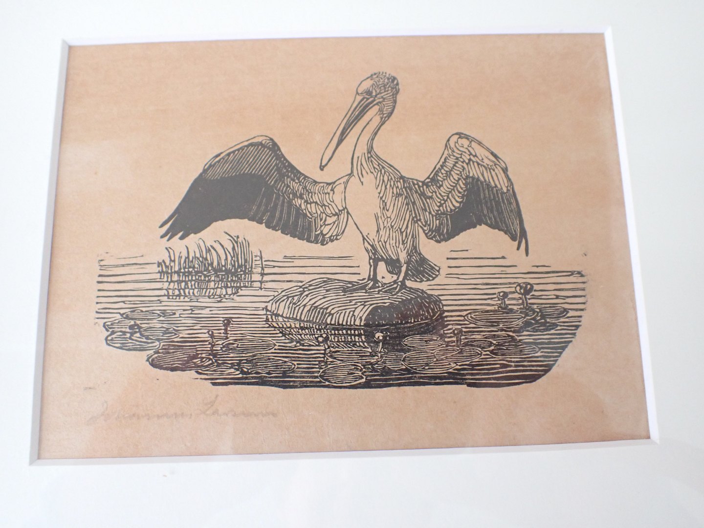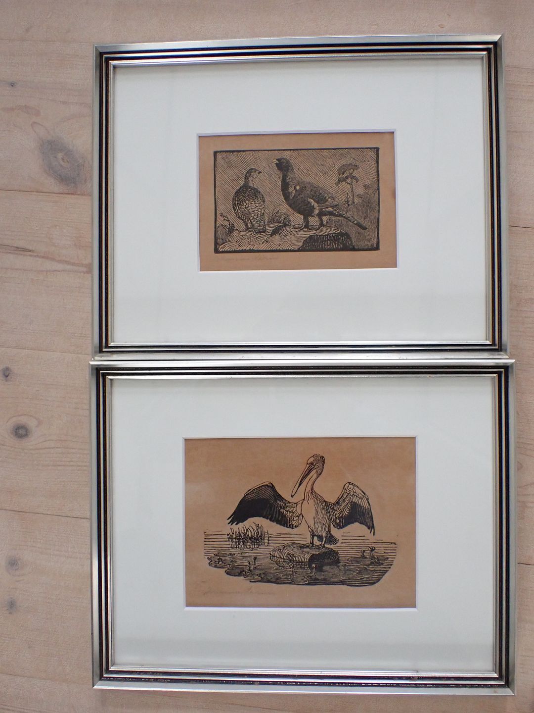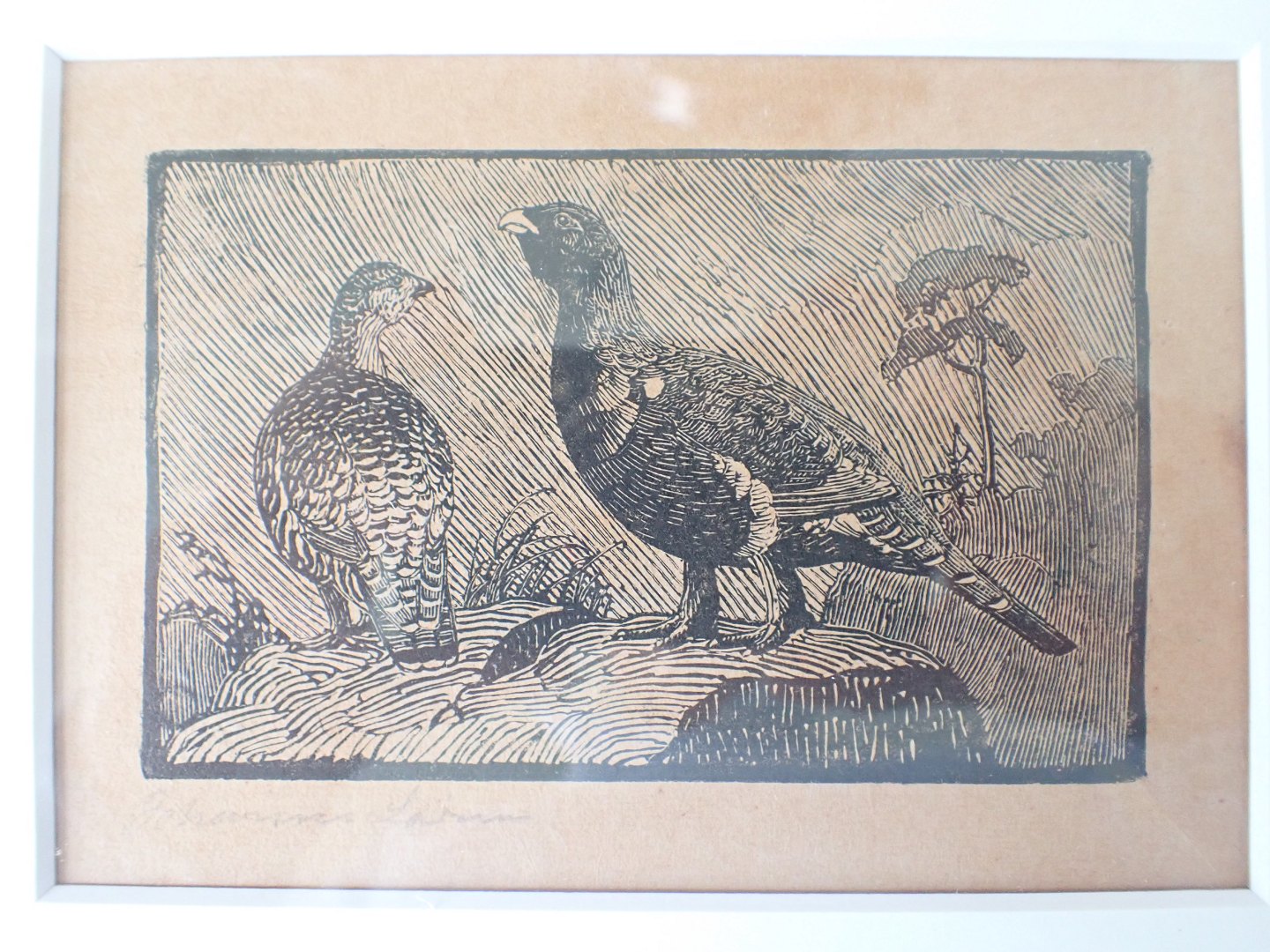 Johannes Larsen (1867 -1961) - to små indrammede træsnit - motiver: Agerhønsepar og Stork med udslåede vinger. Signeret i bly: Johannes Larsen. Mål med ramme: 19x24 cm. Nyistandsat på syrefri baggrund og med med passepartout - træsnittene er lysgulnet.