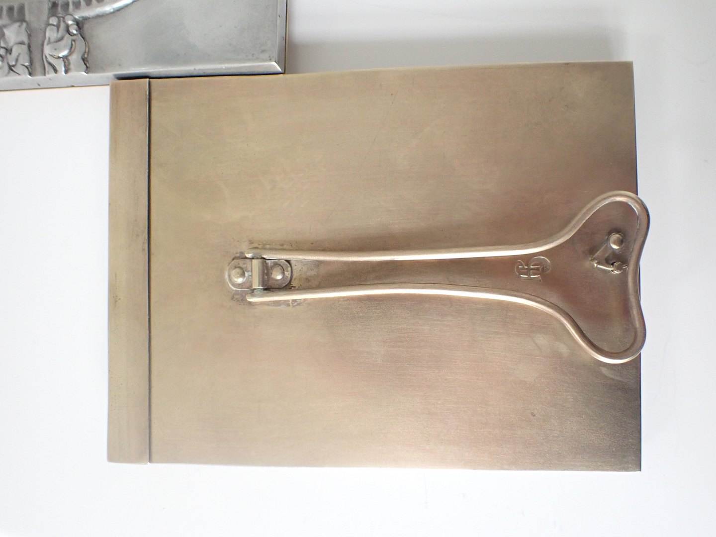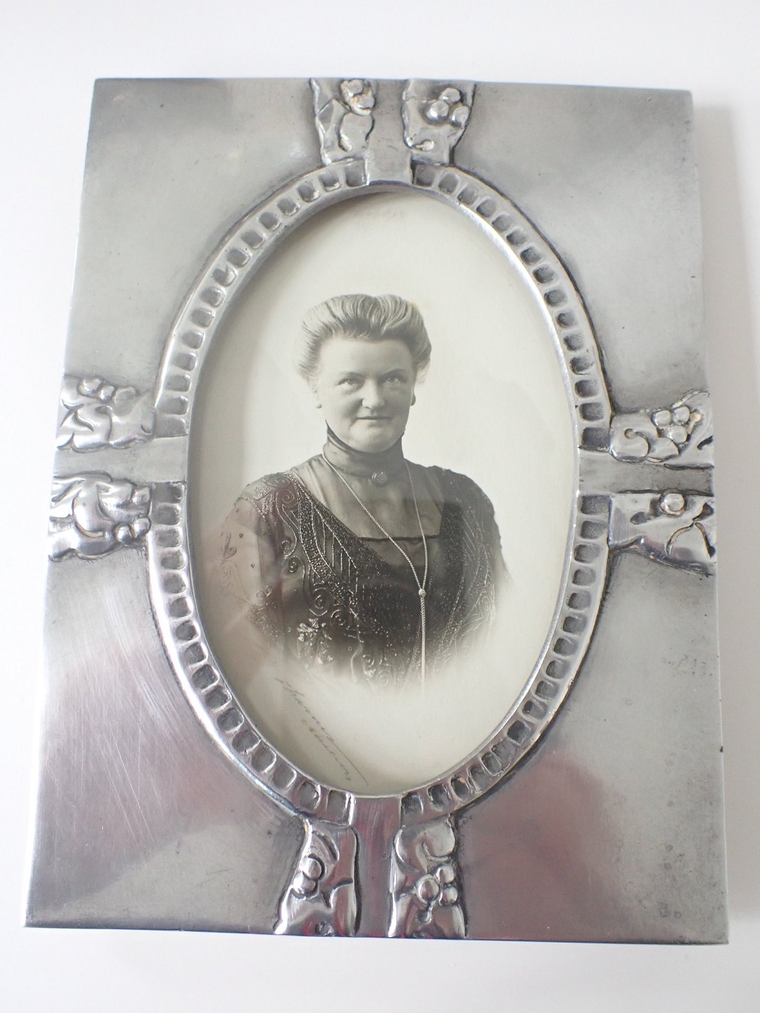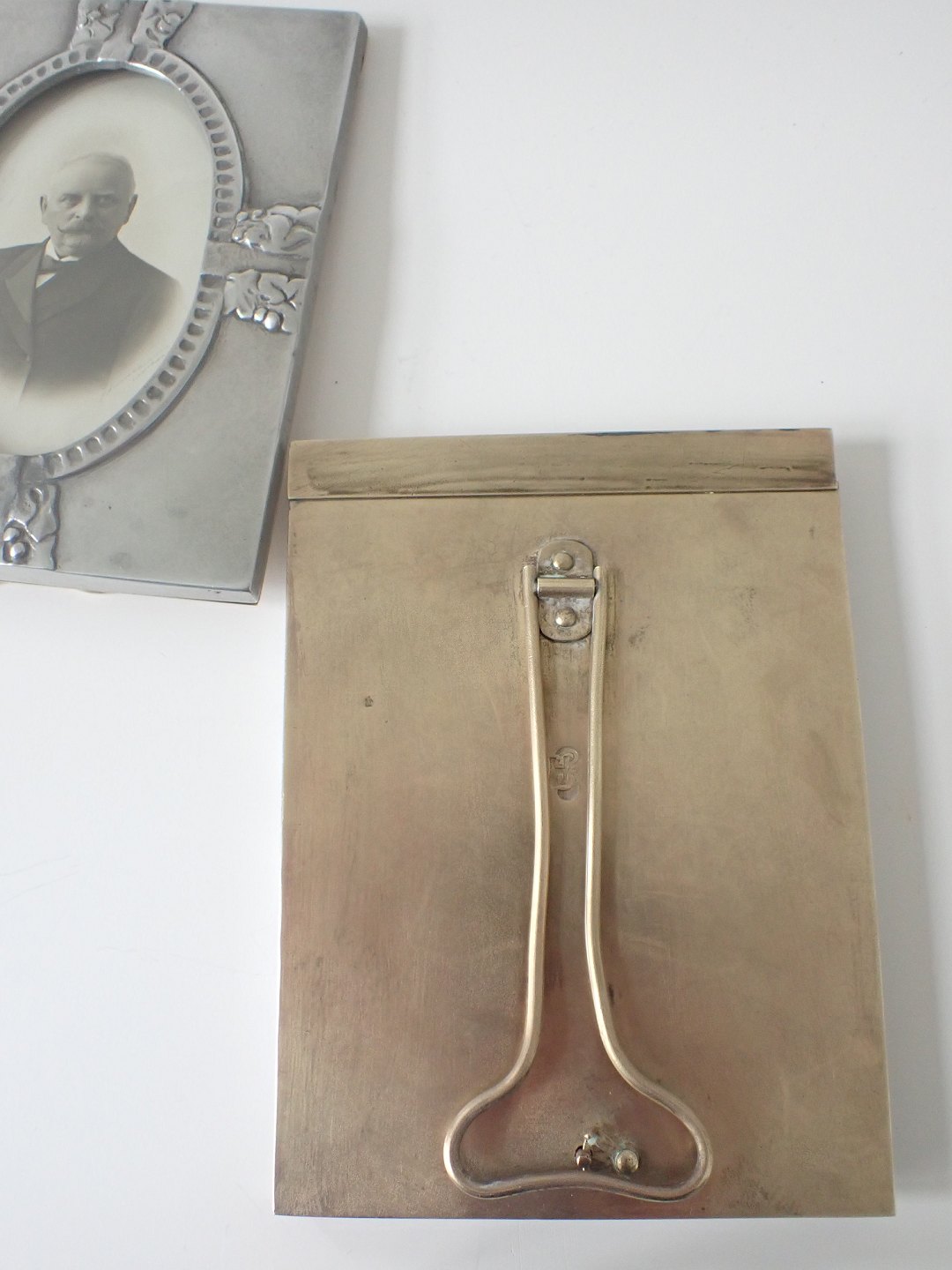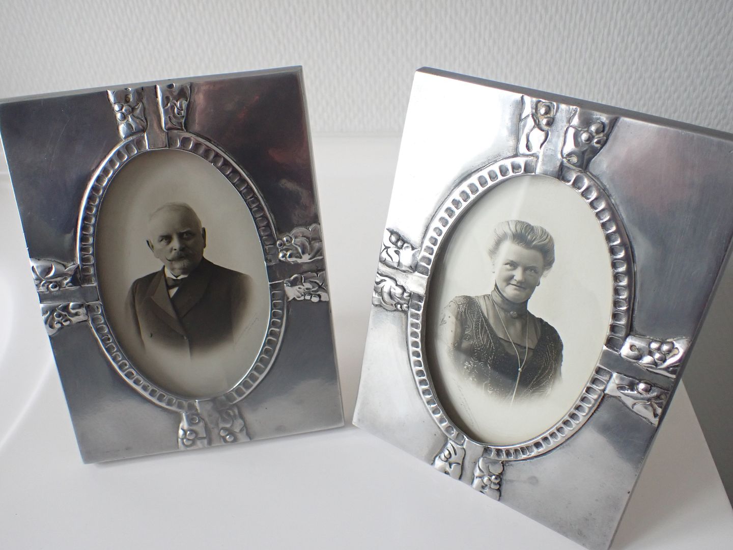 Mogens Ballins Eftf. Hertz (1906 -1926), et par ens skønvirke fototinramme med messingbagplade og stander. Stemplet HB. Kvittering ved billedebagside 1925. Er med i Vejenbogen i mindre visitkortudgave T148 side 199. Design Mogens Ballin. I fin stand. Ydre mål: 15,4 x 11,5 cm. Ovalt billedfelt Lodret diameter: 10,8 og vandret: 6,7. cm. Kan sælges som par eller enkeltvis til 1700 kr. pr. stk.