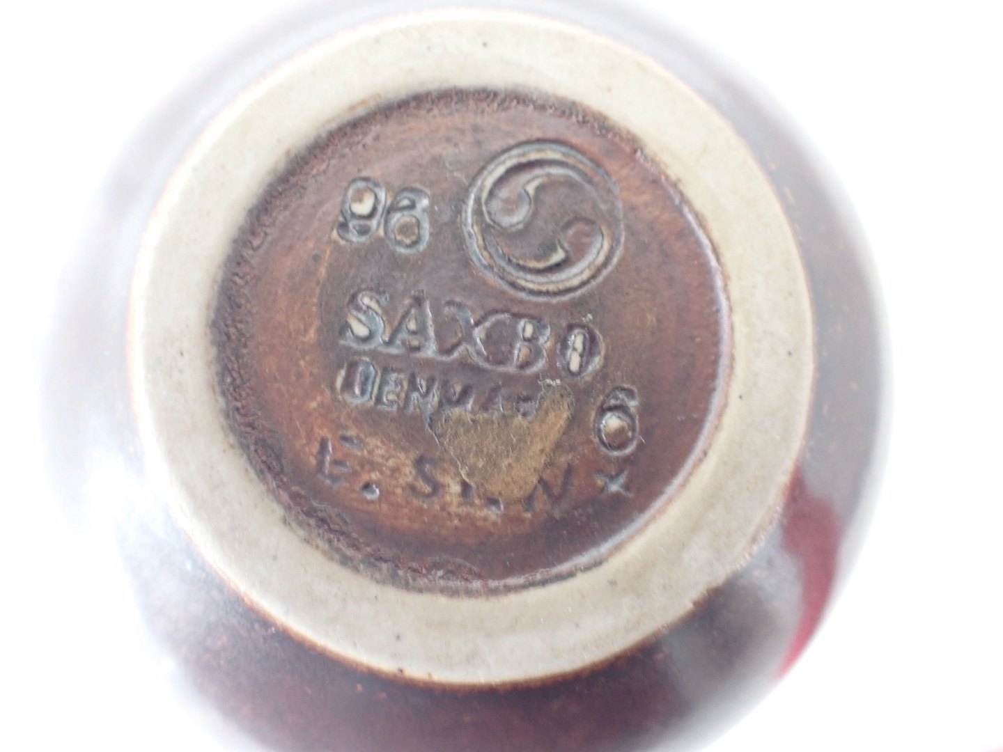 Eva Stær Nielsen (1911 - 1976) for Saxbo - Buttet dråbeformet vase med smal hals og brun, let flammet harepelsglasur # 96. Stemplet Yin/yan mærket Saxbo, Denmark, E.ST.N. Højde: 12 cm. Bredeste diameter: 9,5 cm. I fin stand.