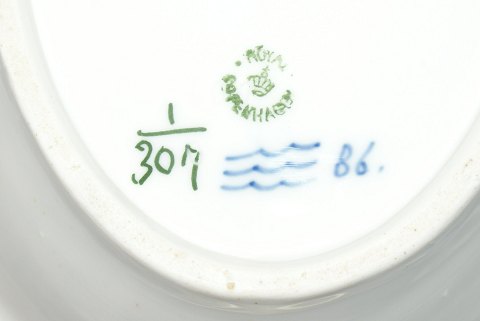 Kongelig Musselmalet Riflet, Oval skål Fra før 1923 Dek. nr. 1/307 1. Sortering Størrelse 22 x 17,5 cm. Perfekt stand.