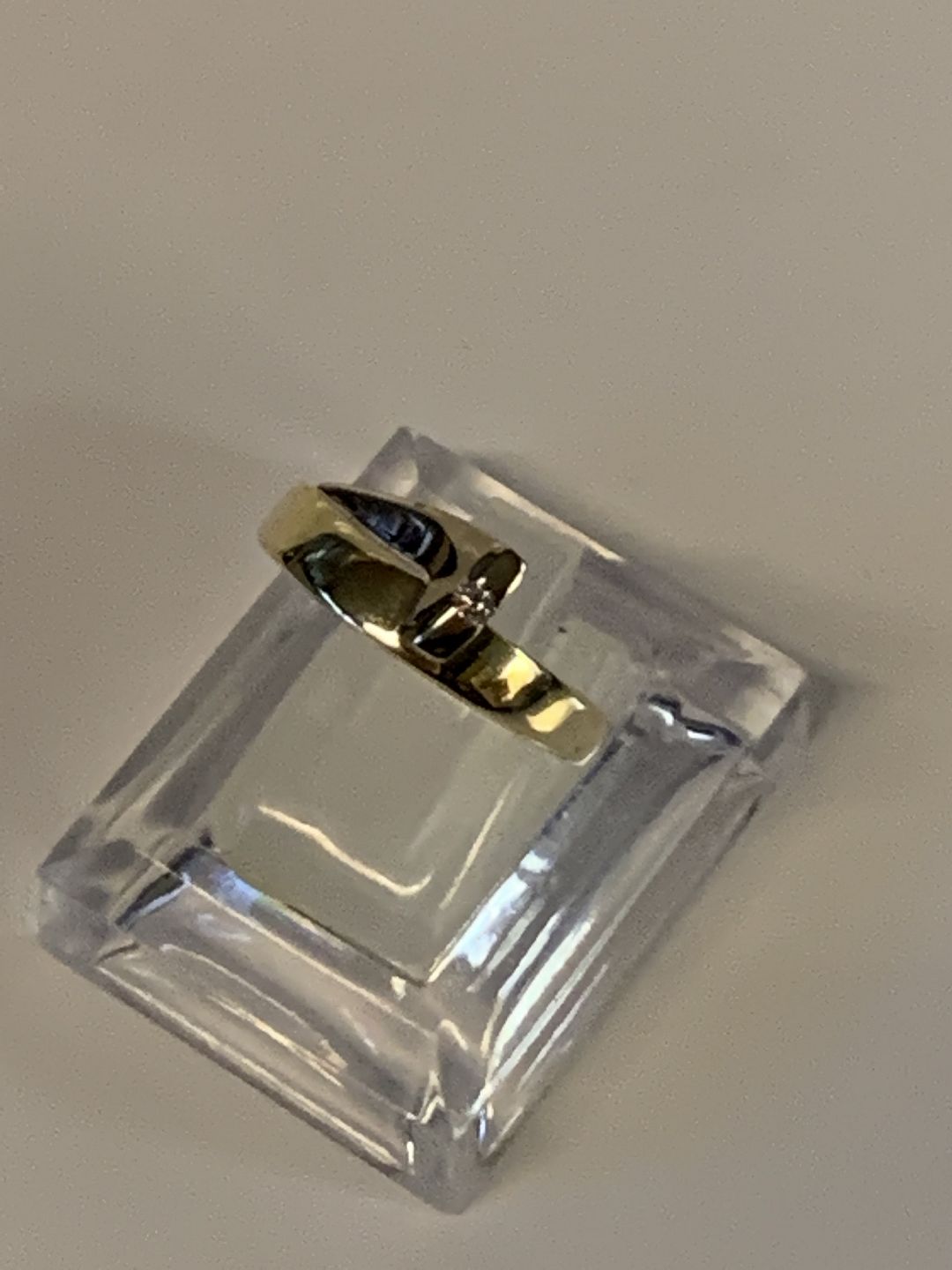 Damering med Diamant i 14 karat guld / hvidguld Stemplet SC 585 Størrelse 56 Flot og velholdt stand. Varen findes ikke fysisk i butikken. Kontakt os for fremvisning