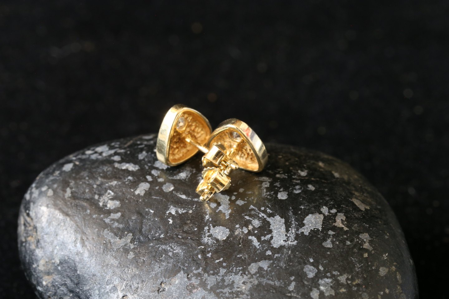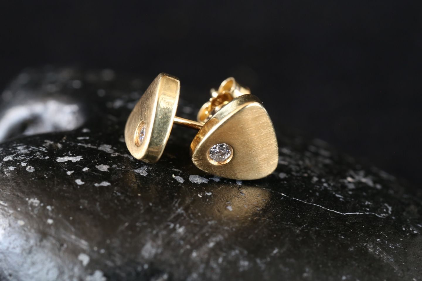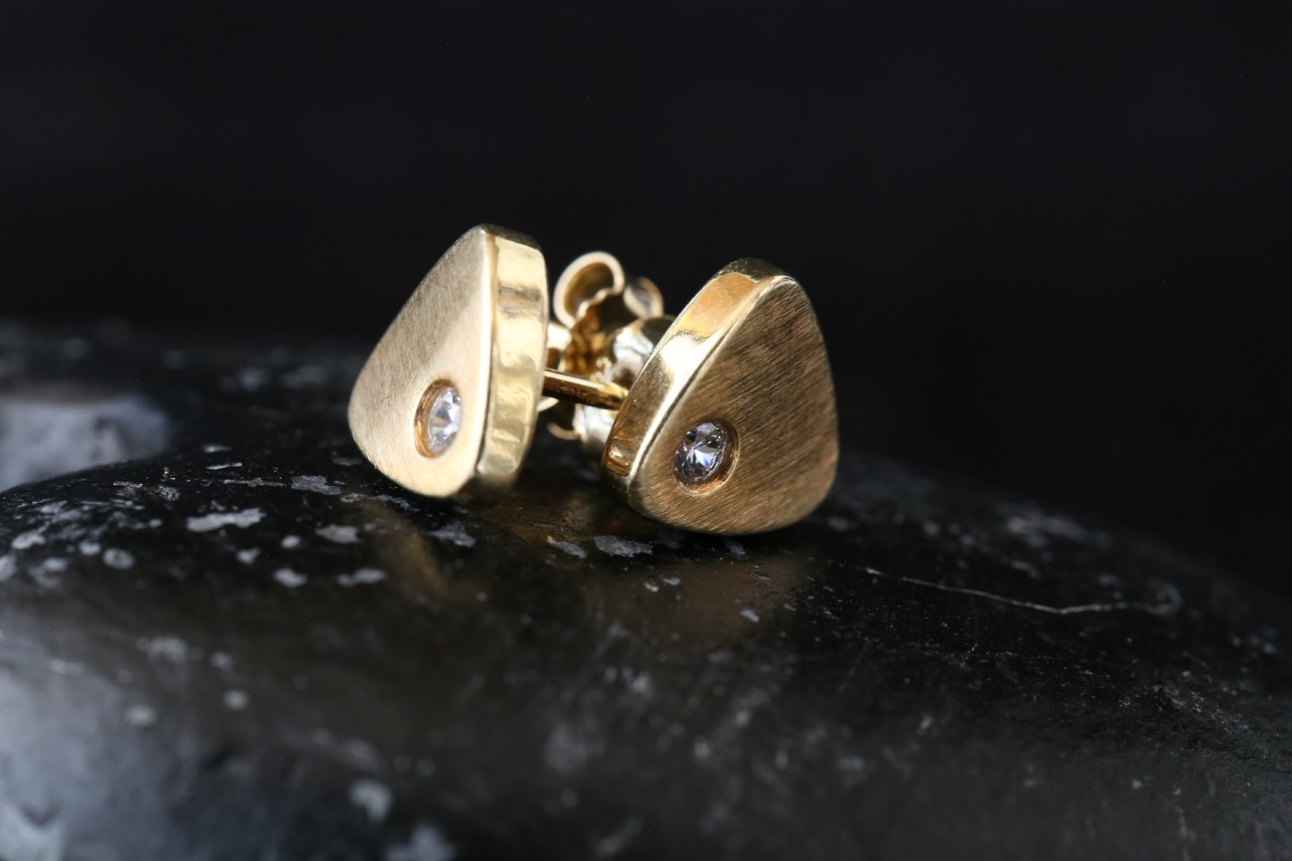 Flotte ørestifter i 14 karat guld, med indlagt klar sten. Ørestifterne er eksklusive, når de fremstår i guld. Den elegante trekantede form med afrundede kanter, er flot og elegant. Da disse ørestifter ikke er så store, kan de kombineres med andre øreringe eller stifter.