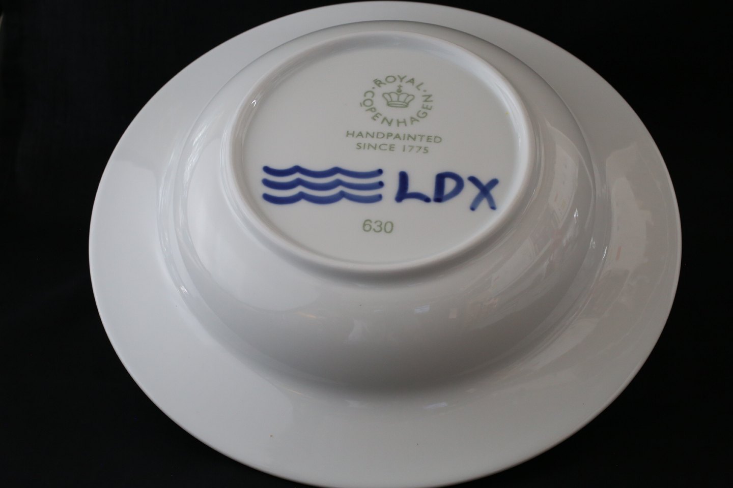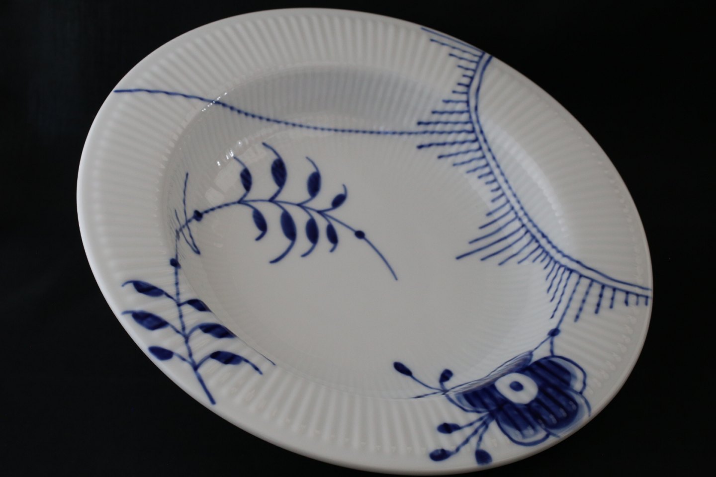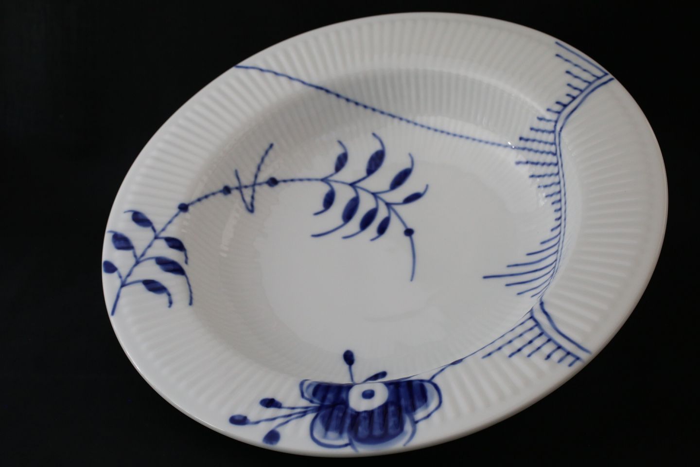 Mega mussel pasta plate in blue and white, deck. No. 630, first factory. Large deep plate, and can be used for many other purposes than for pasta. Eg. like a fruit bowl. This dish turns your dining table into something extra elegant, and can be combined with many other products from mega mussel.