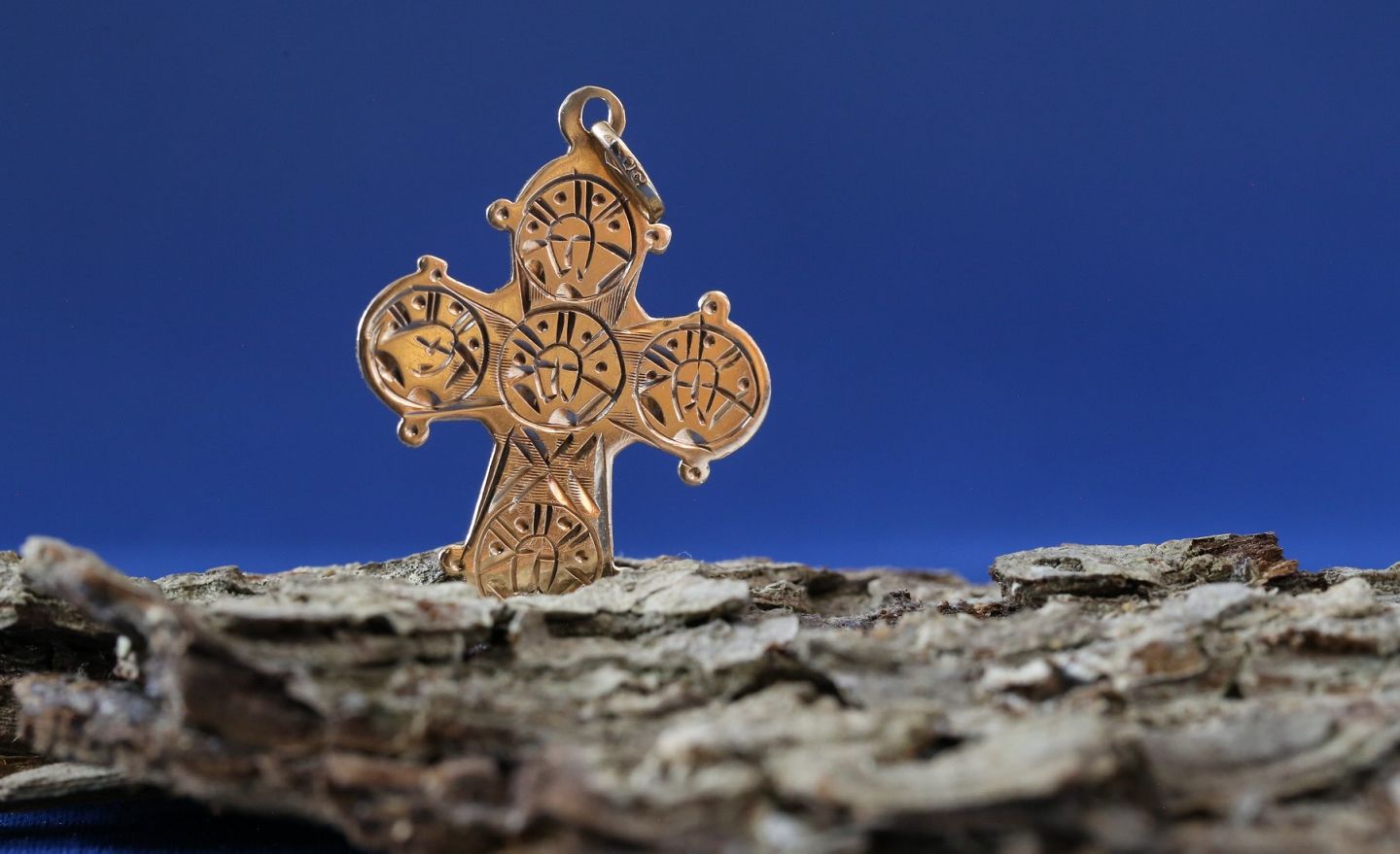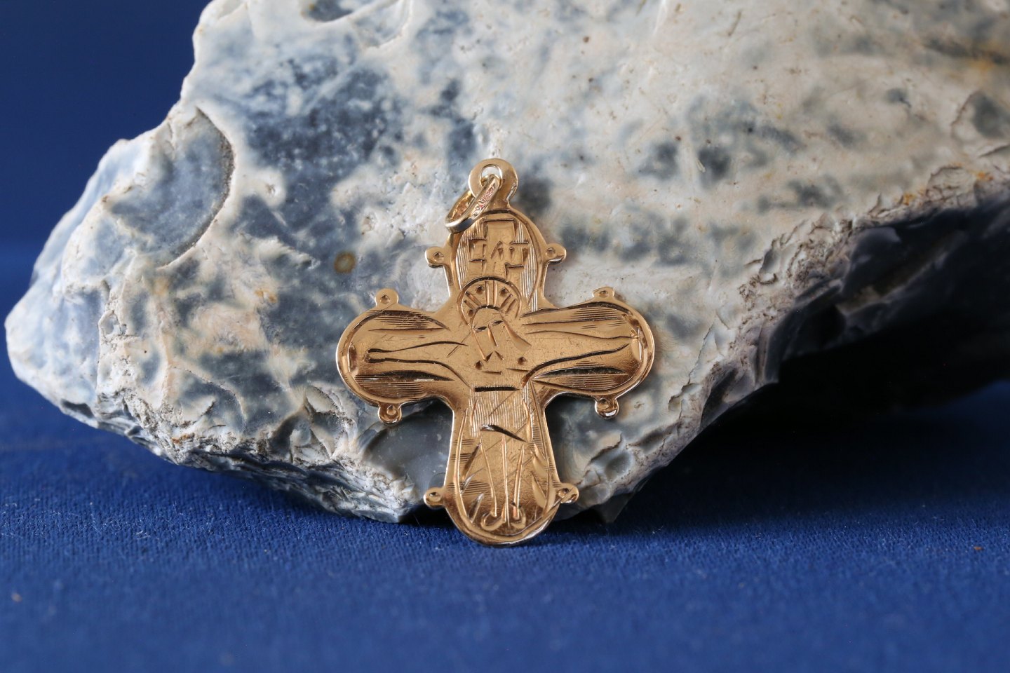 Nice classic Daymark cross in 14 carat gold, with nice details. The cross has beautiful drawings of Christ on one side, and beautiful ornamentation on the other. The cross is particularly suitable as a confirmation gift, and can be worn beautifully on a thin gold chain.