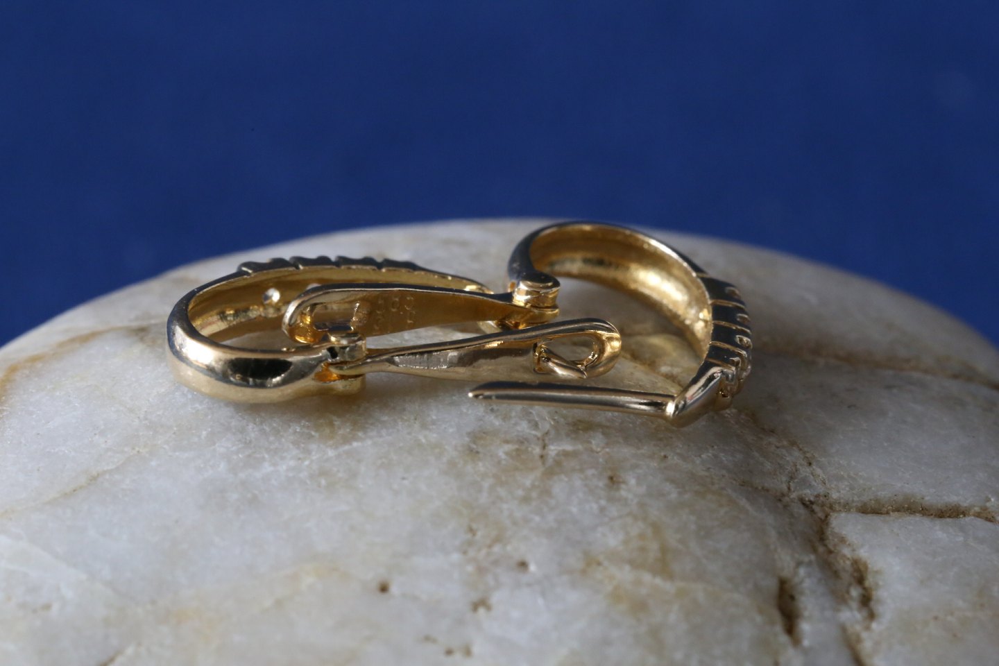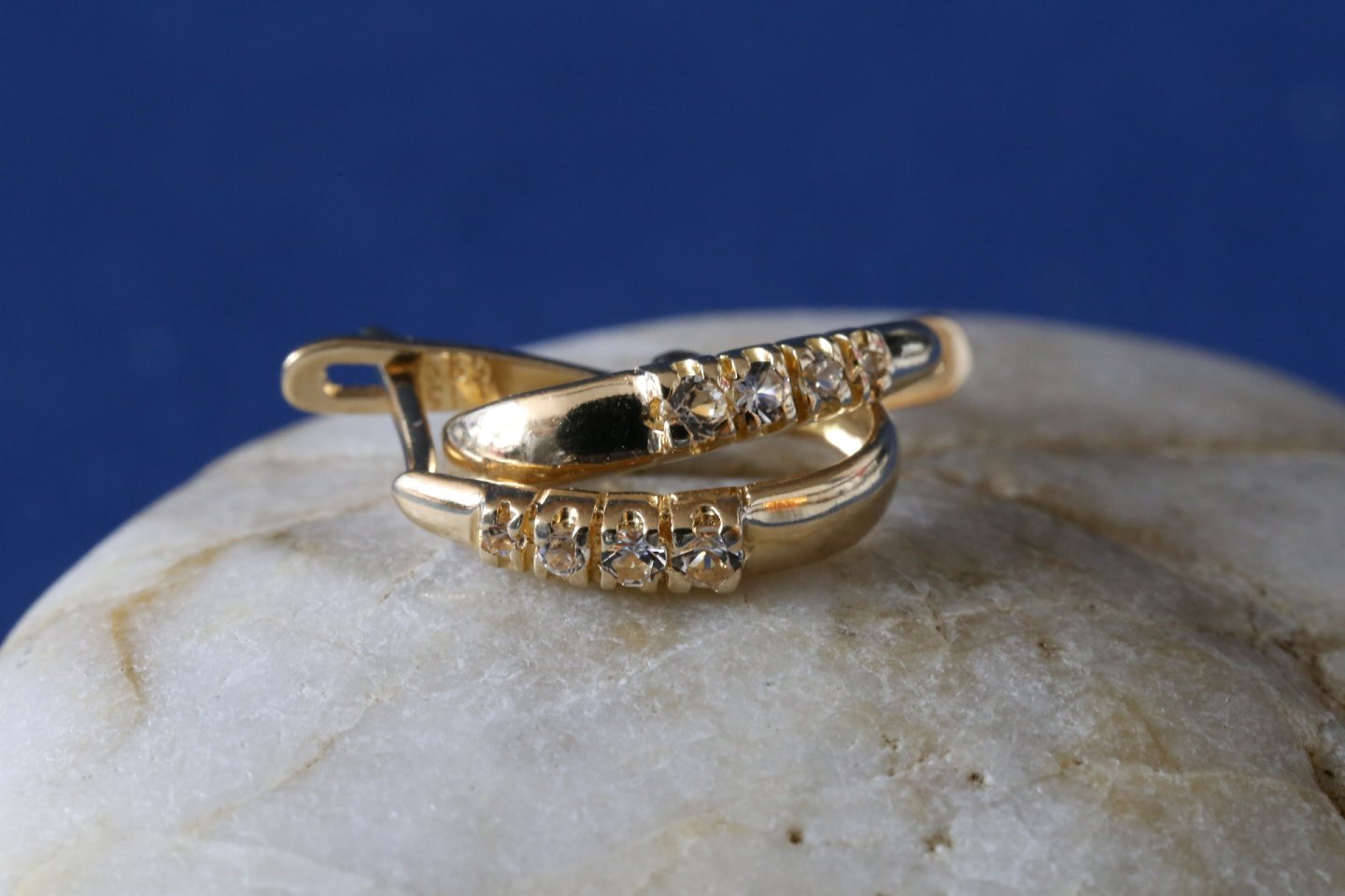 Nice gold earrings of 1.5 cm, in 14 carat gold with inlaid clear white stones. The earrings have a nice curved shape, which goes together with the earlobe. This makes the earring appear very elegant and stylish. The earrings can be used for almost any occasion, and will be the perfect accessory for a nice yellow chain or gold bracelet.