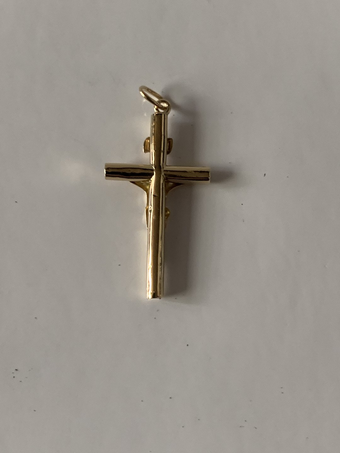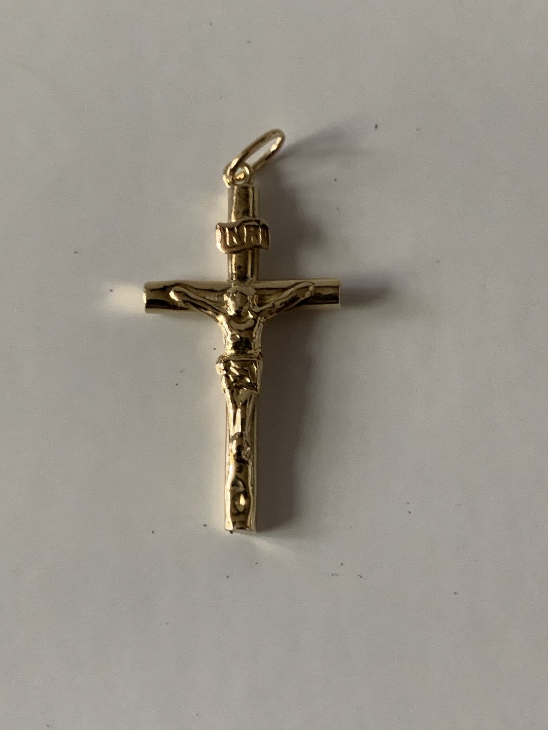 Beautiful and iconic gold cross in 14 carat gold, with many beautiful details. The cross is designed with the suffering Christ on the cross, with the inscription INRI above Christ. INRI is the Latin abbreviation for "Iesus Nazarenus Rex Iudaeorum" - or in Danish, Jesus from Nazareth, King of the Jews. It is a strong religious symbol that will make a splendid necklace in a nice gold chain.