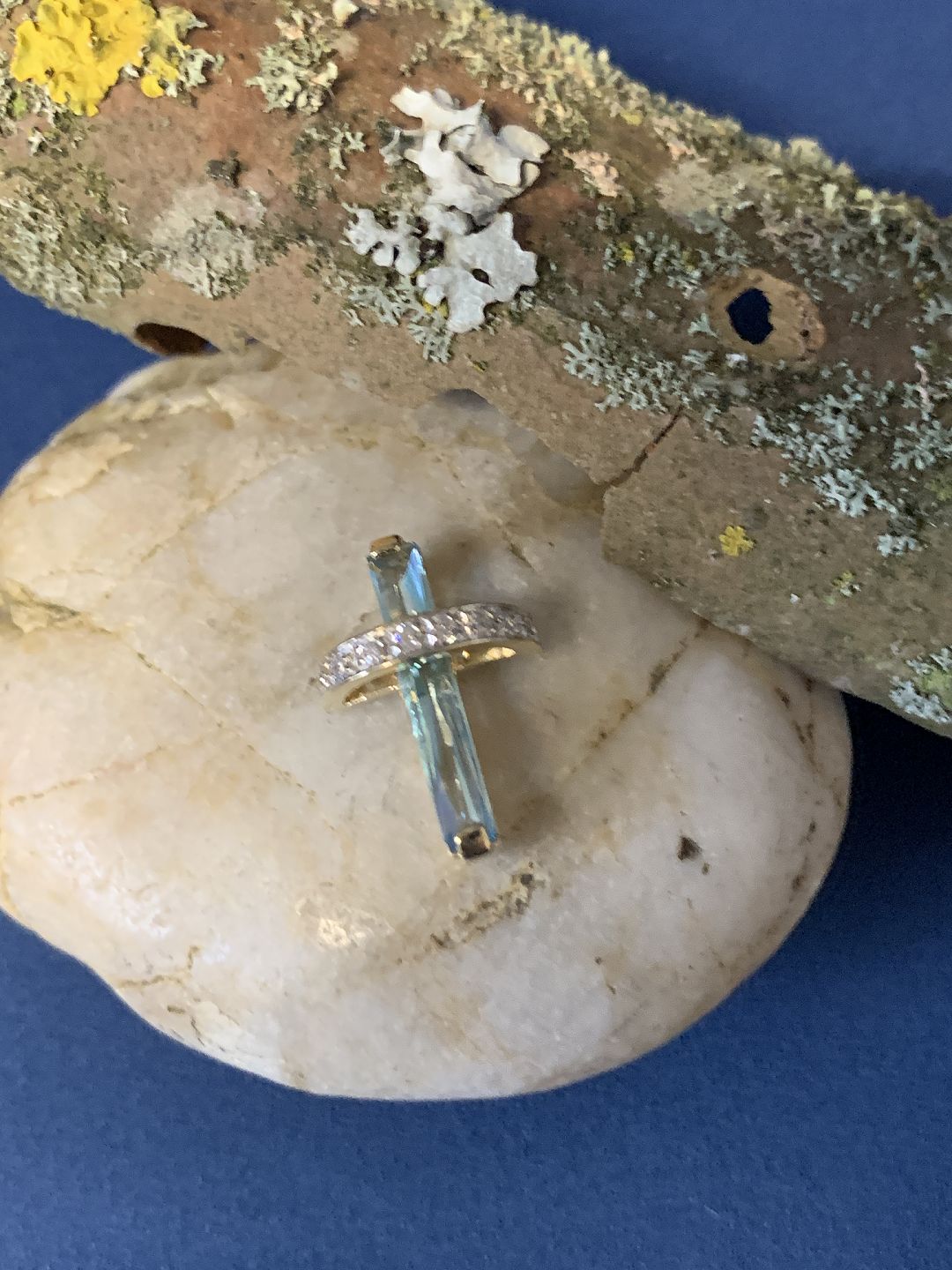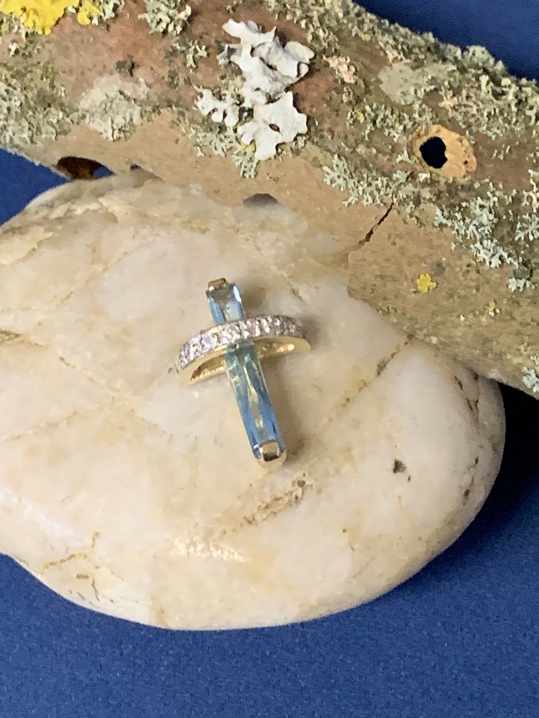Very beautiful and unique small pendant in 14 carat gold. The piece is shaped like a cross, where the vertical part is made of gold, with a beautiful clear stone in the middle. The transverse band is also studded with small clear stones. A very unique pendant that can be advantageously combined with a thin gold chain.