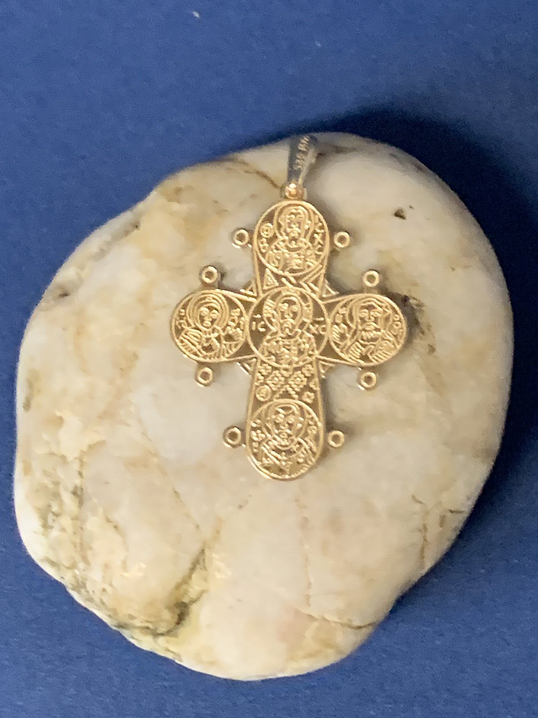 On the obverse is the suffering Christ, and on the reverse Jesus is depicted in the middle, with the Virgin Mary to his left and John the Baptist to his right. Above and below Jesus are the 2 famous saints from the Byzantine Church. Basil the Great at the top and Johannes Chrysostemos at the bottom.