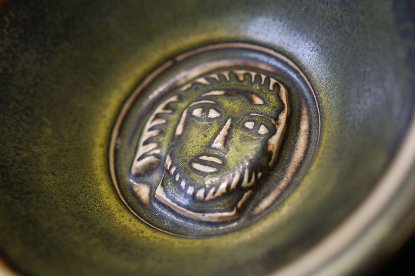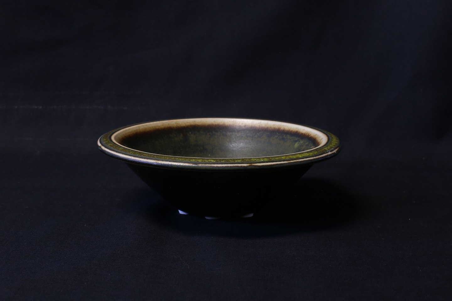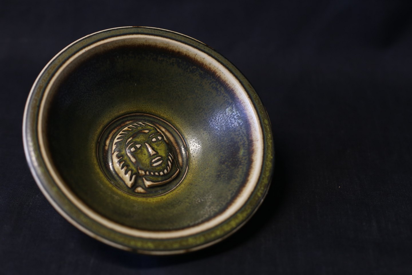 Jais skål fra Royal Copenhagen i flot olivengrøn farve, med motiv i bunden af skålen. Skålen er udført i flot design. Skålen kan bruges enten servering eller pynt på bordet.