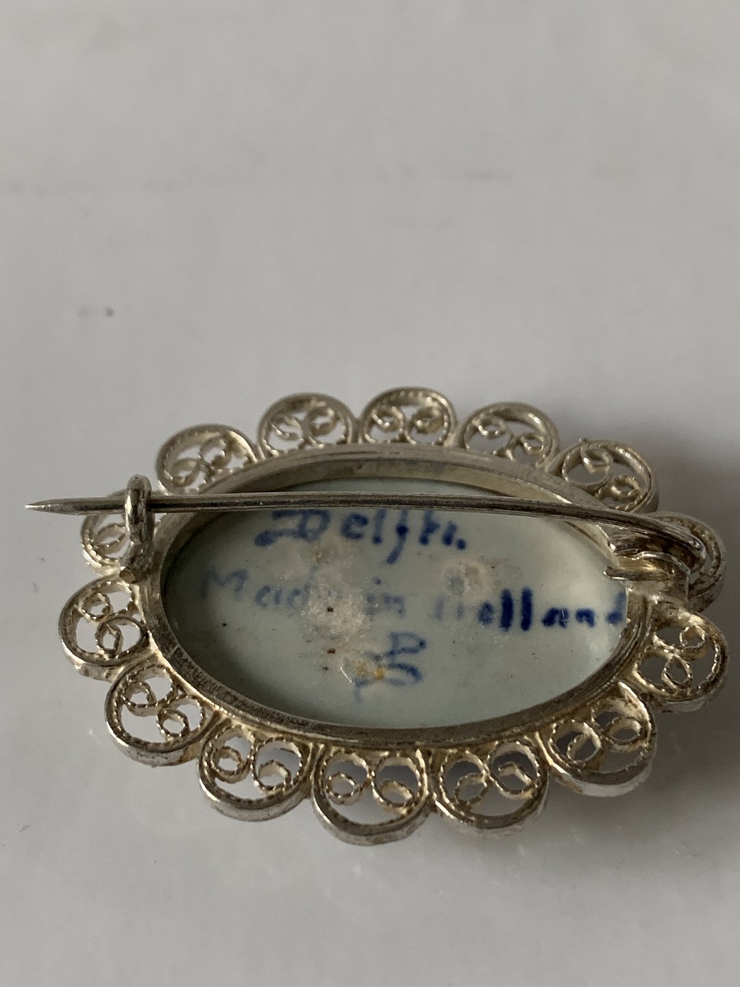 Silver brooch Delft with porcelain inlay, with beautiful Dutch mill.