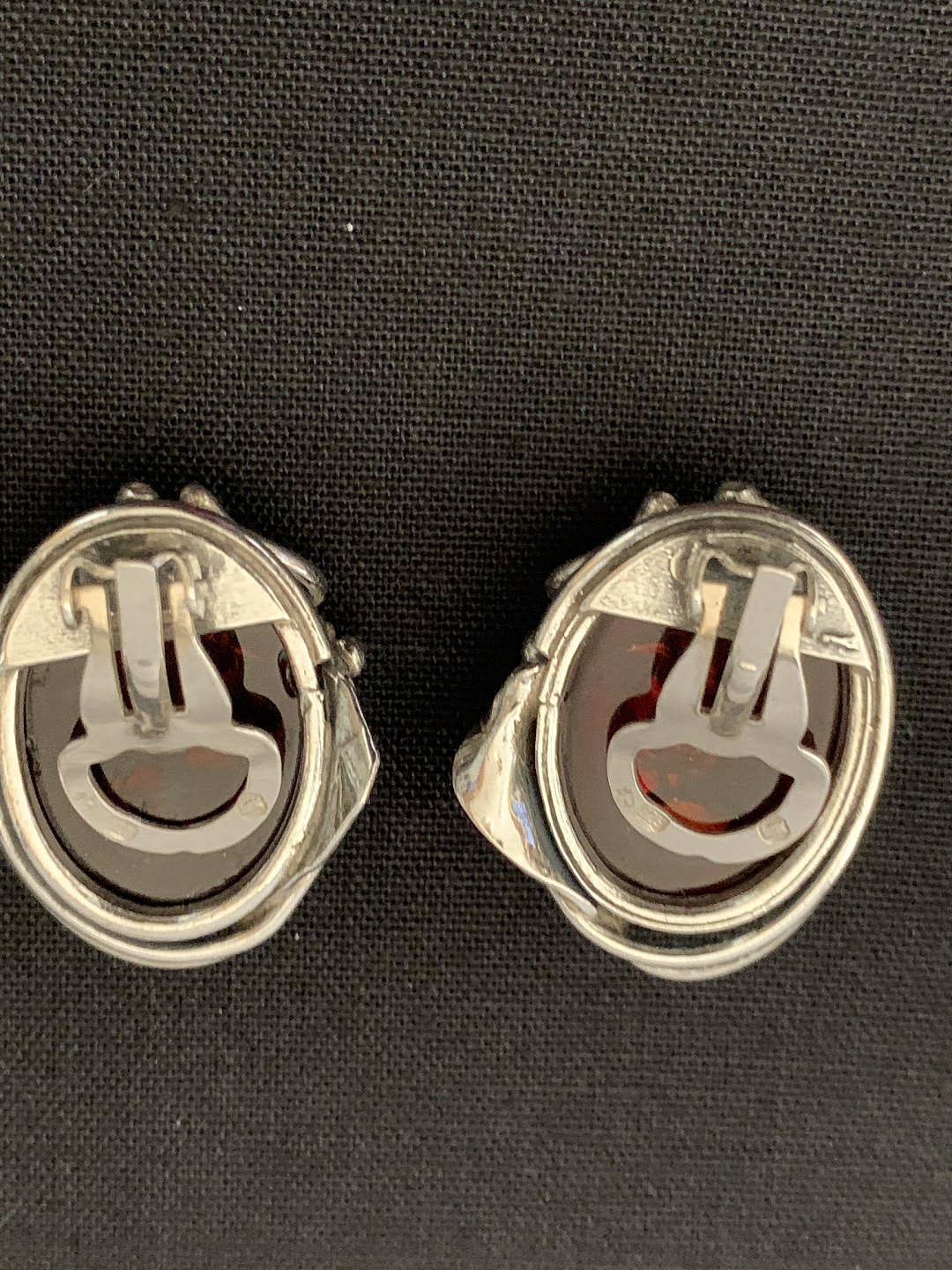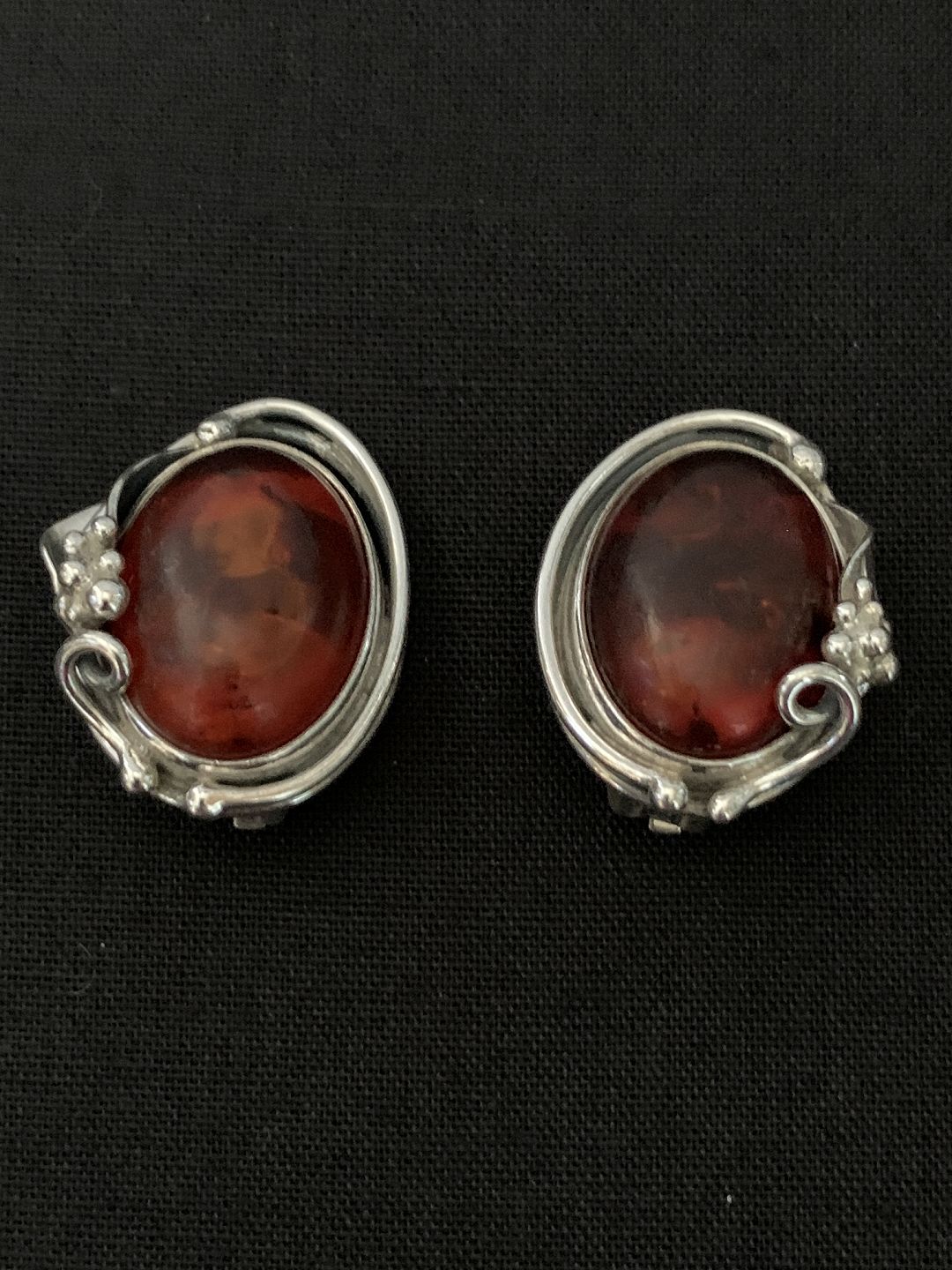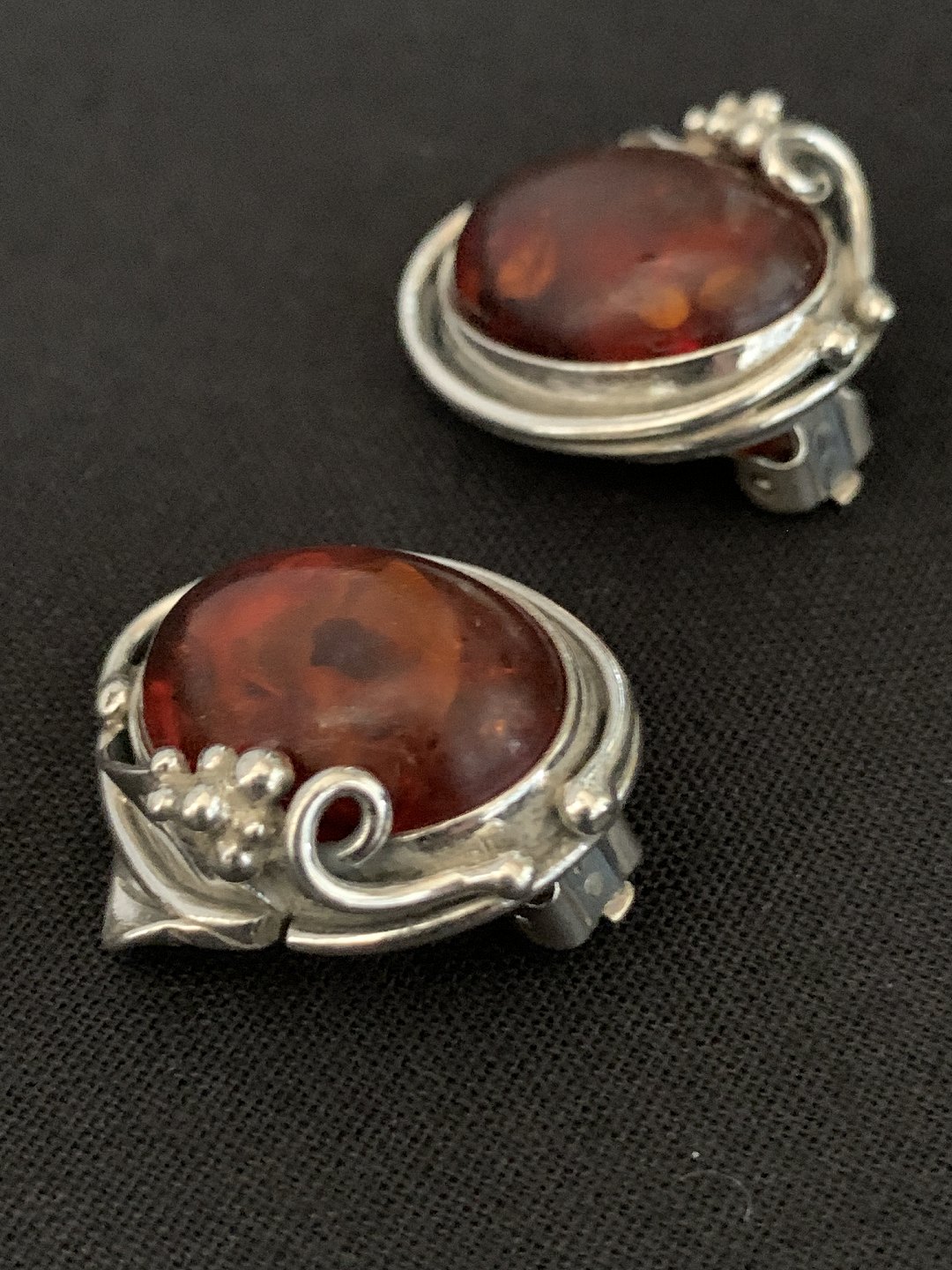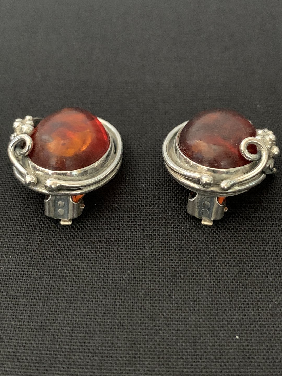 Silver ear clip with inlaid amber Stamped WK 925 Height 2.5 cm Width 2.0 cm See also our large selection of silver earrings at the antique house here: https://www.antikhuset.net/katindex.asp?kukat=1745