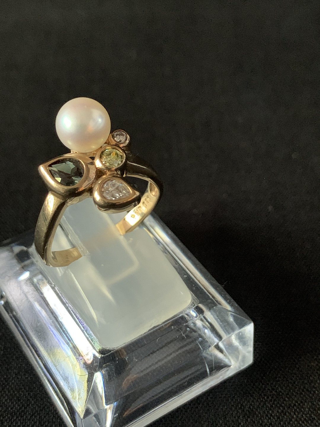 Beautiful and elegant ladies' ring in 8 carat gold, with inlaid real pearl and stone. Size 56