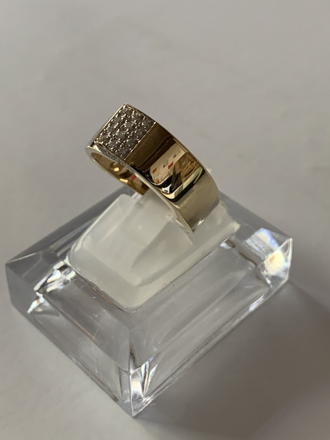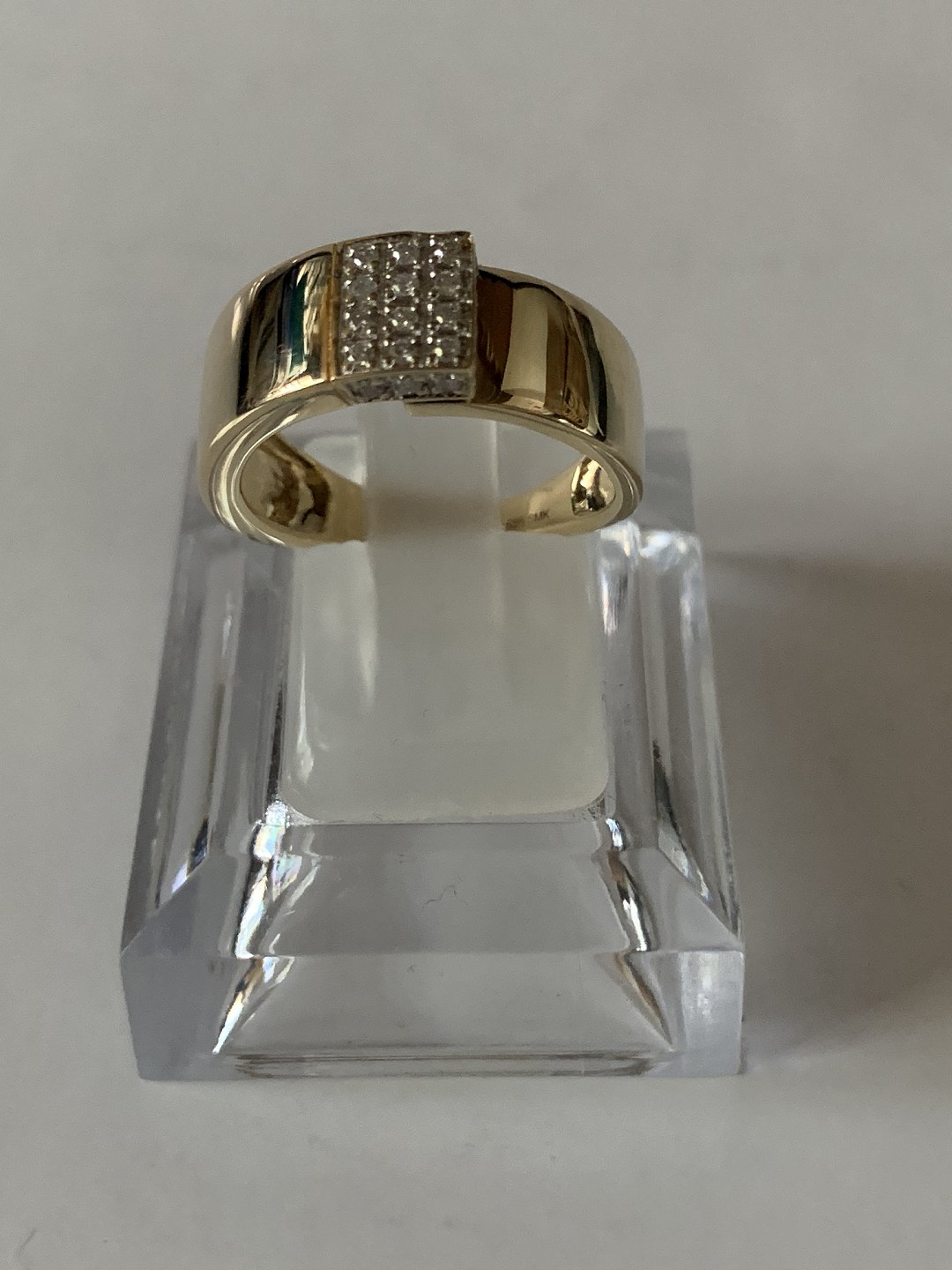 Guldring i 14 karat, stemplet SMK 585, str. 54. Diamanter