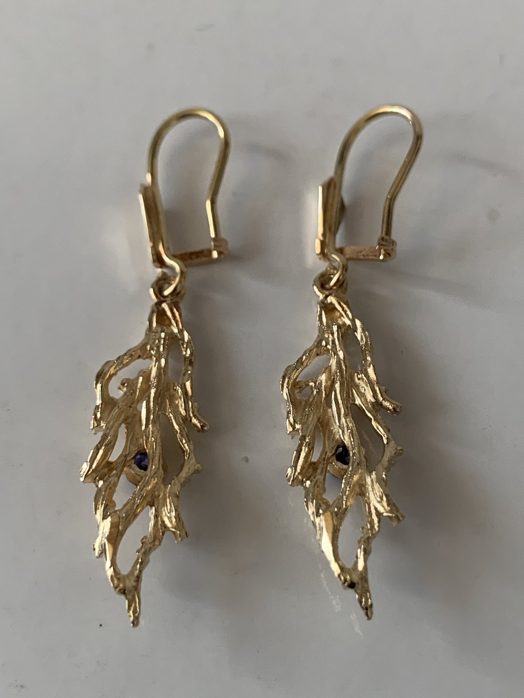 Beautiful gold earrings with purple stones hanging in the earring. The earrings are shaped like a leaf, composed of fine small gold threads. This gives the earrings a light and timeless look. The earrings hang in the earring and follow the movements of the head. The beautiful purple stone reflects the light, so the earrings gain dynamism and life.