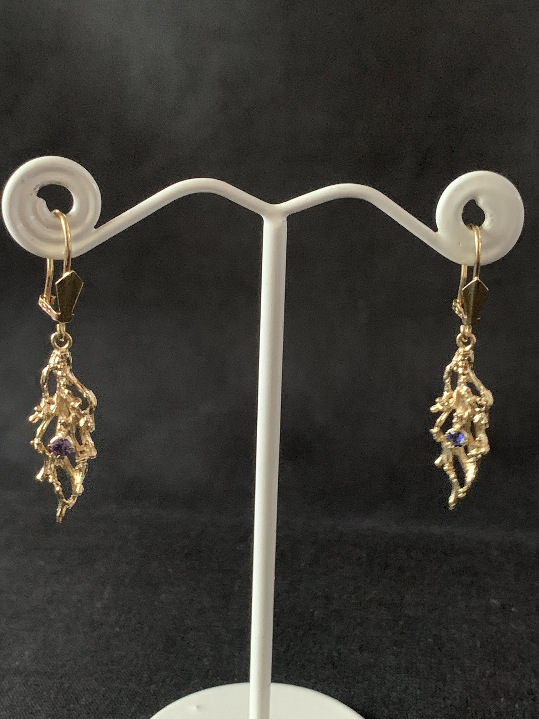 Gold earrings in 14 carat gold, with purple stones and stamped 585 HS