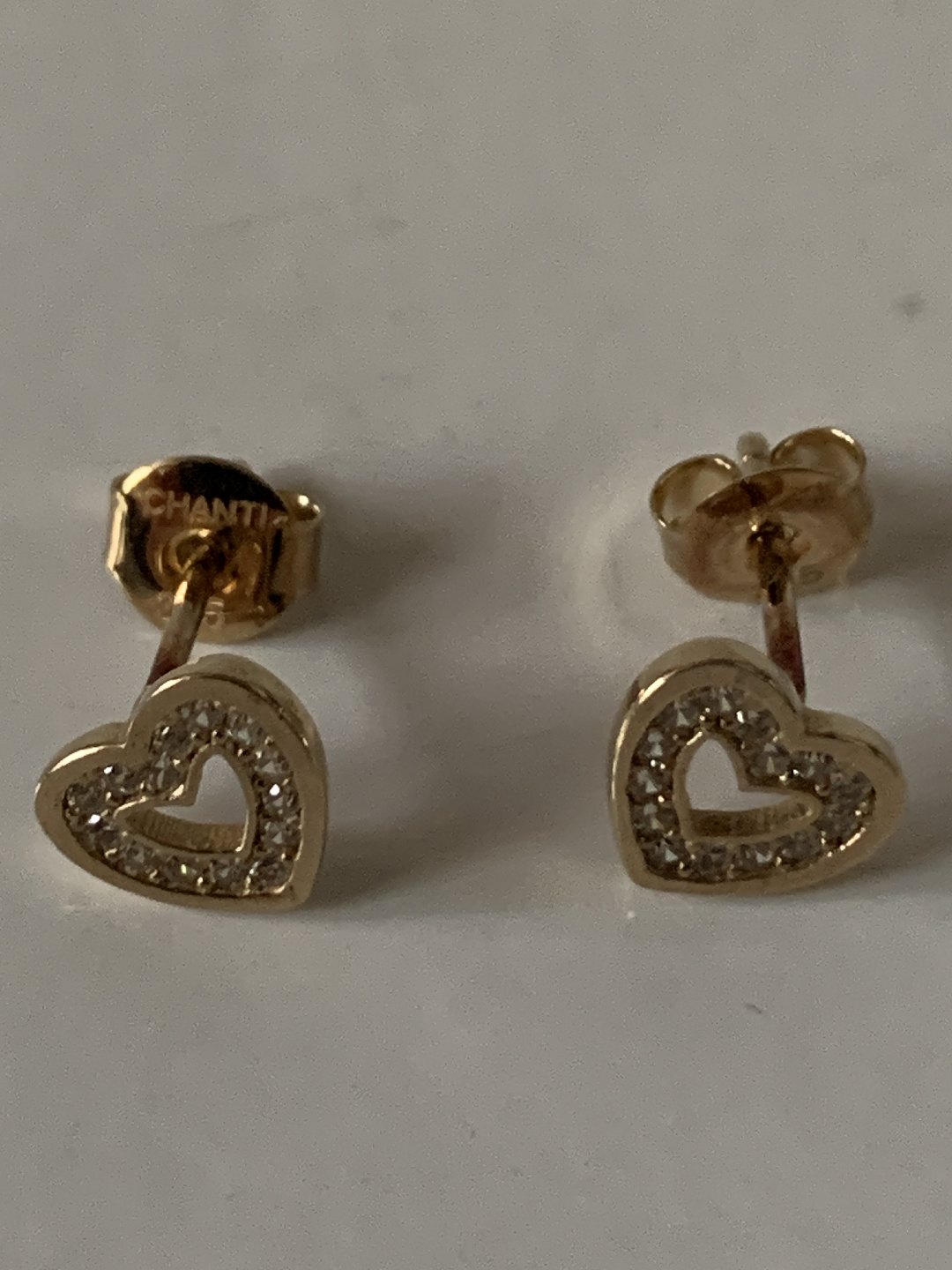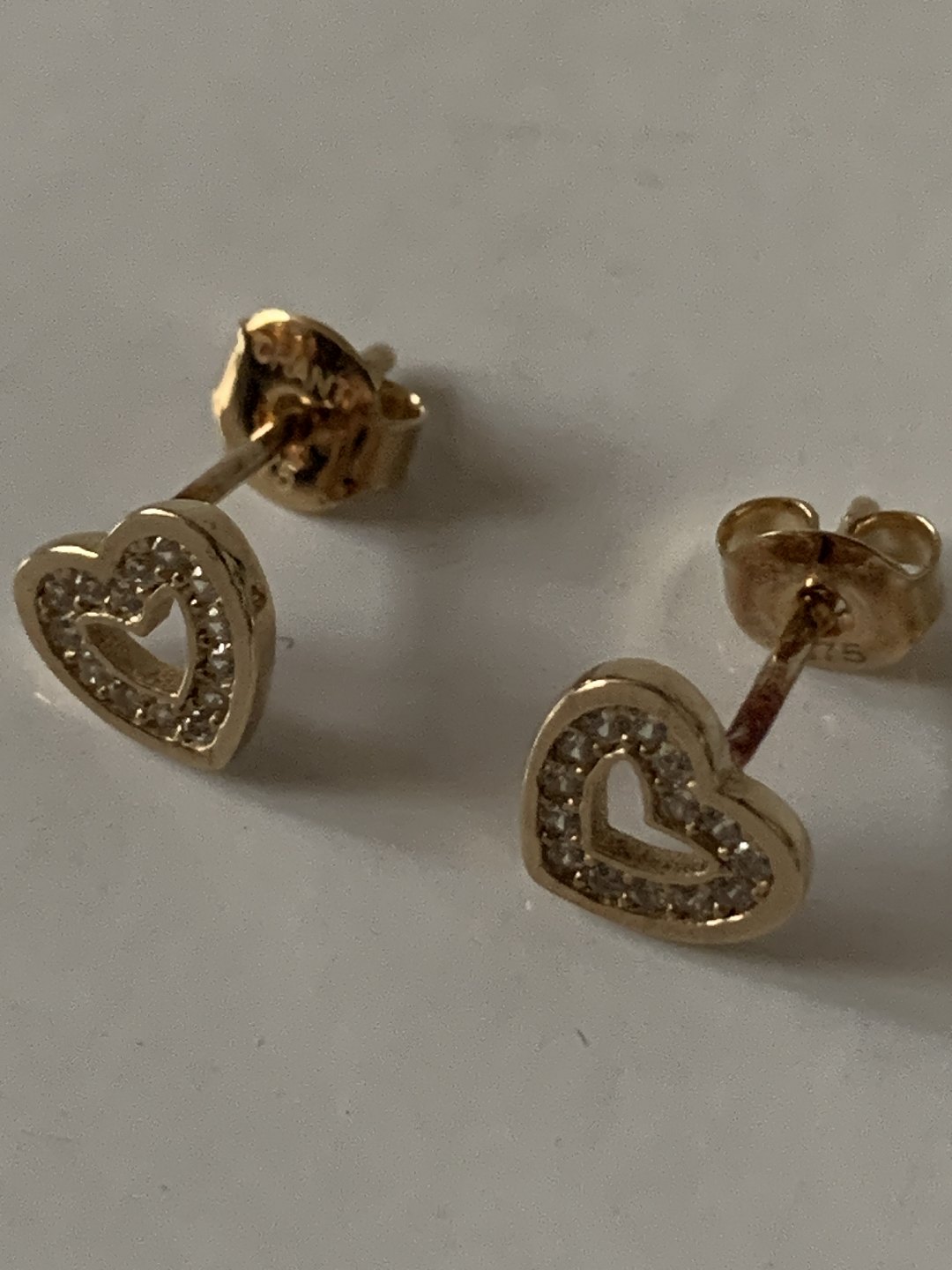 Flotte hjerte ørestifter i 9 karat guld, med indlagt Zirkoner. Ørestifterne er små og diskrete, men alligevel elegante i øreflippen.