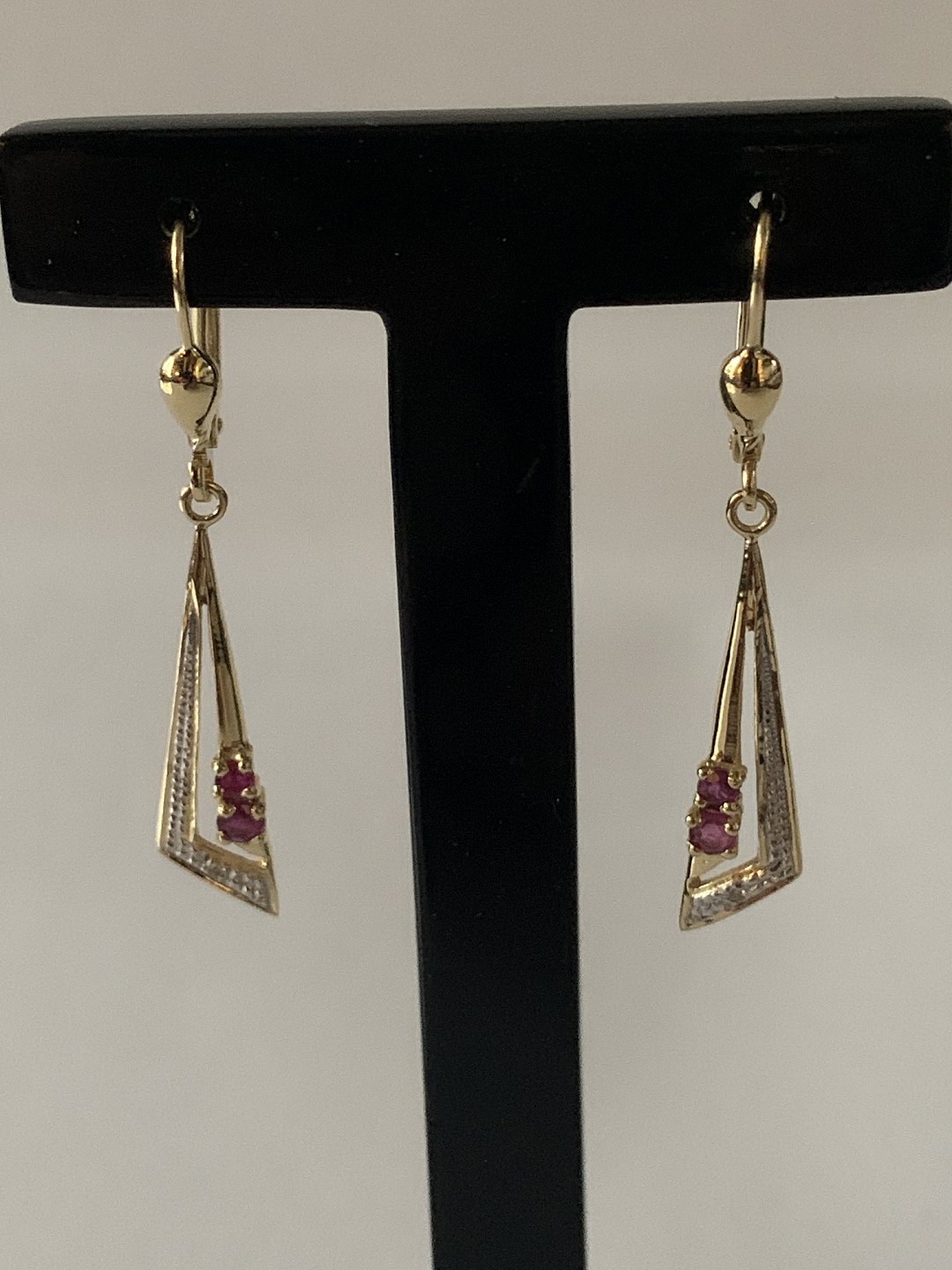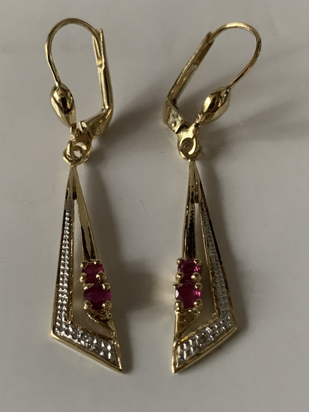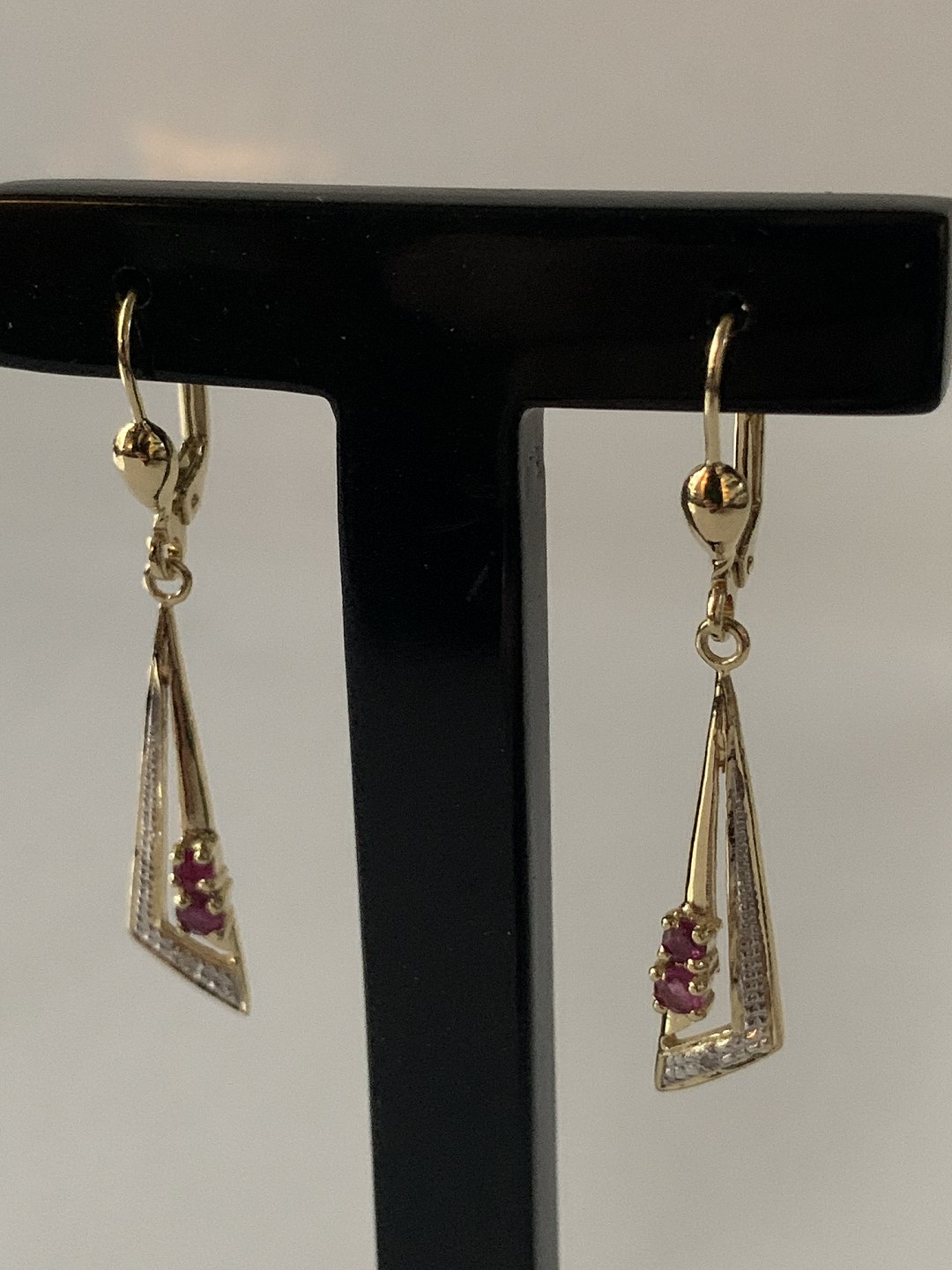 Gold earrings in 14 carat gold, with 2 red rubies and a diamond.