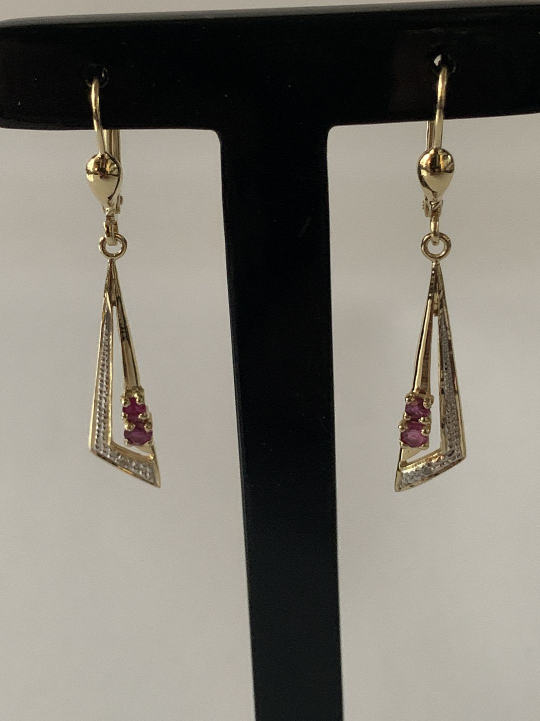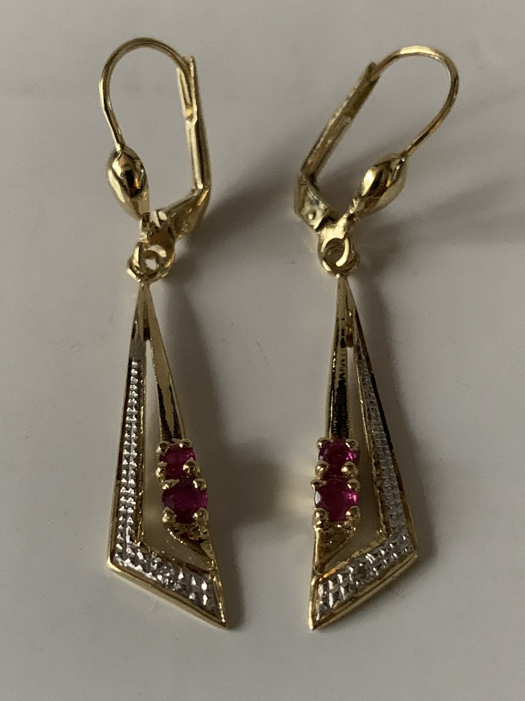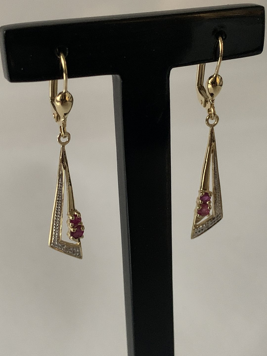 Gold earrings in 14 carat gold, with 2 red rubies and a diamond.