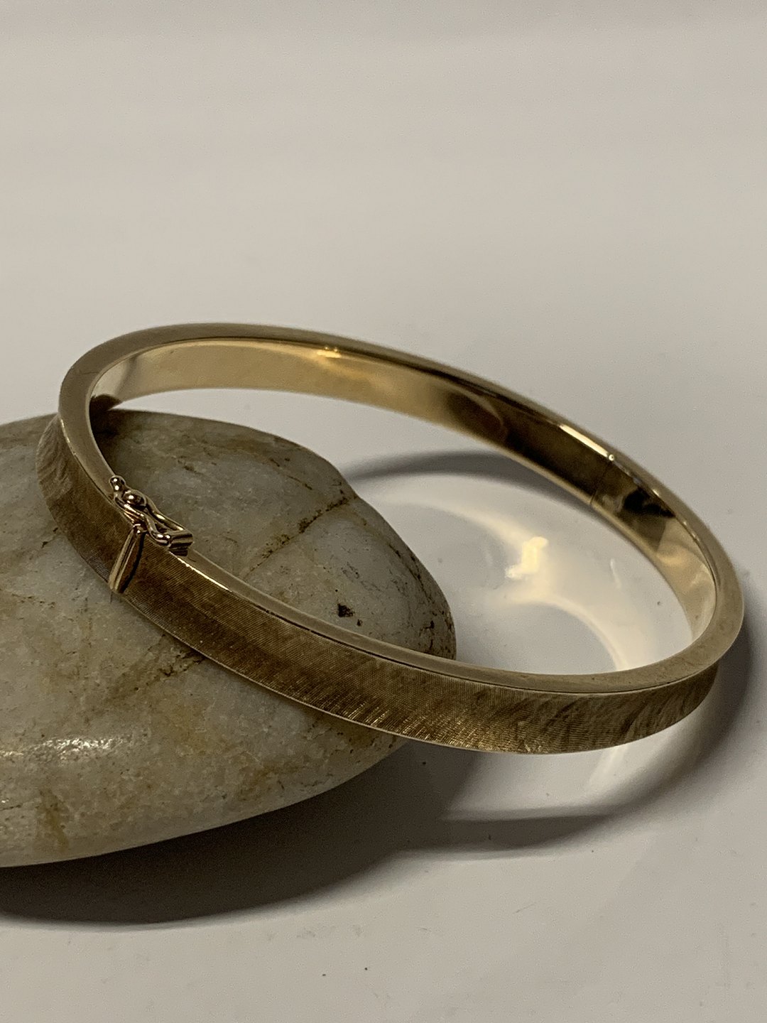 The oval bangle is opened/closed by the mortise lock on the side and there is an additional safety lock in the shape of a figure 8.